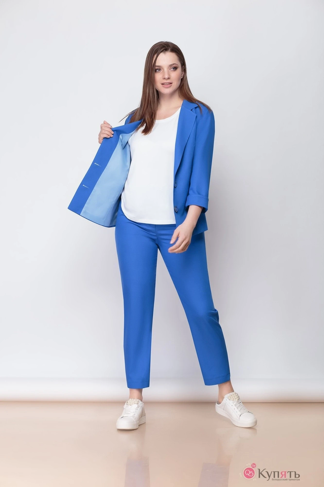 Комплект из жакета, брюк. Жакет из текстильной ткани с воротником с лацканами, рукавами длиной ниже локтя и застежкой спереди на контрастные пуговицы. Передняя полочка на подкладке. Брюки из текстильной ткани с высокой посадкой из текстильного полотна с разрезами со вставкой по низу и застежкой на молнию и пуговицу.