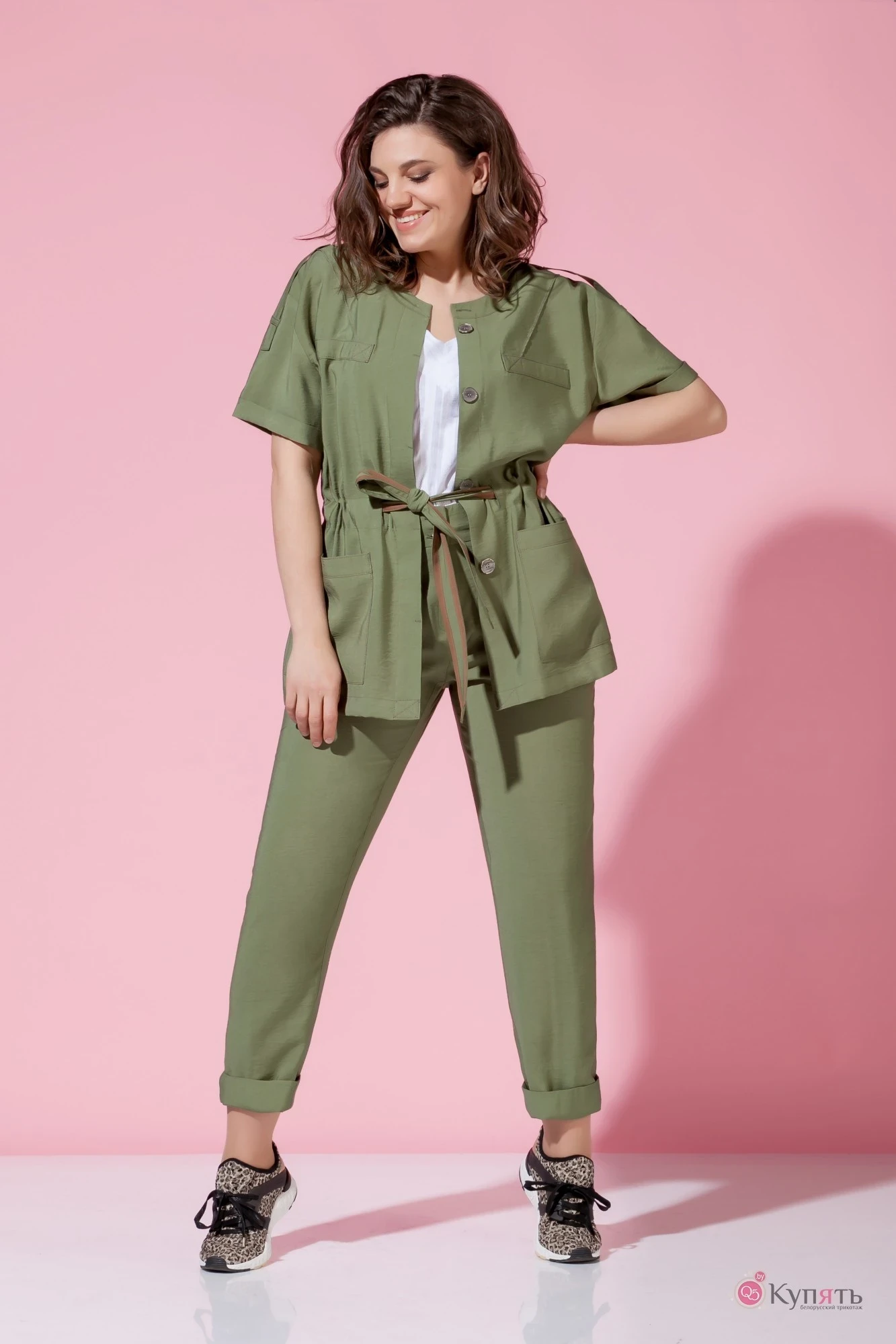 Женский жакет из костюмной ткани прямого силуэта с центральной потайной застежкой на петли и пуговицы. Горловина округлой формы. Линия плеча спущена, рукав короткий с манжетой, по переду обработаны накладные карманы и пояс на кулисе, спинка по линии талии на резинке. Брюки прямого кроя с 2 складками от пояса и с наклонными карманами, сзади карманы-листочки. Длина спинки-70 см. Длина рукава-20 см, Длина по боковому шву-105 см.