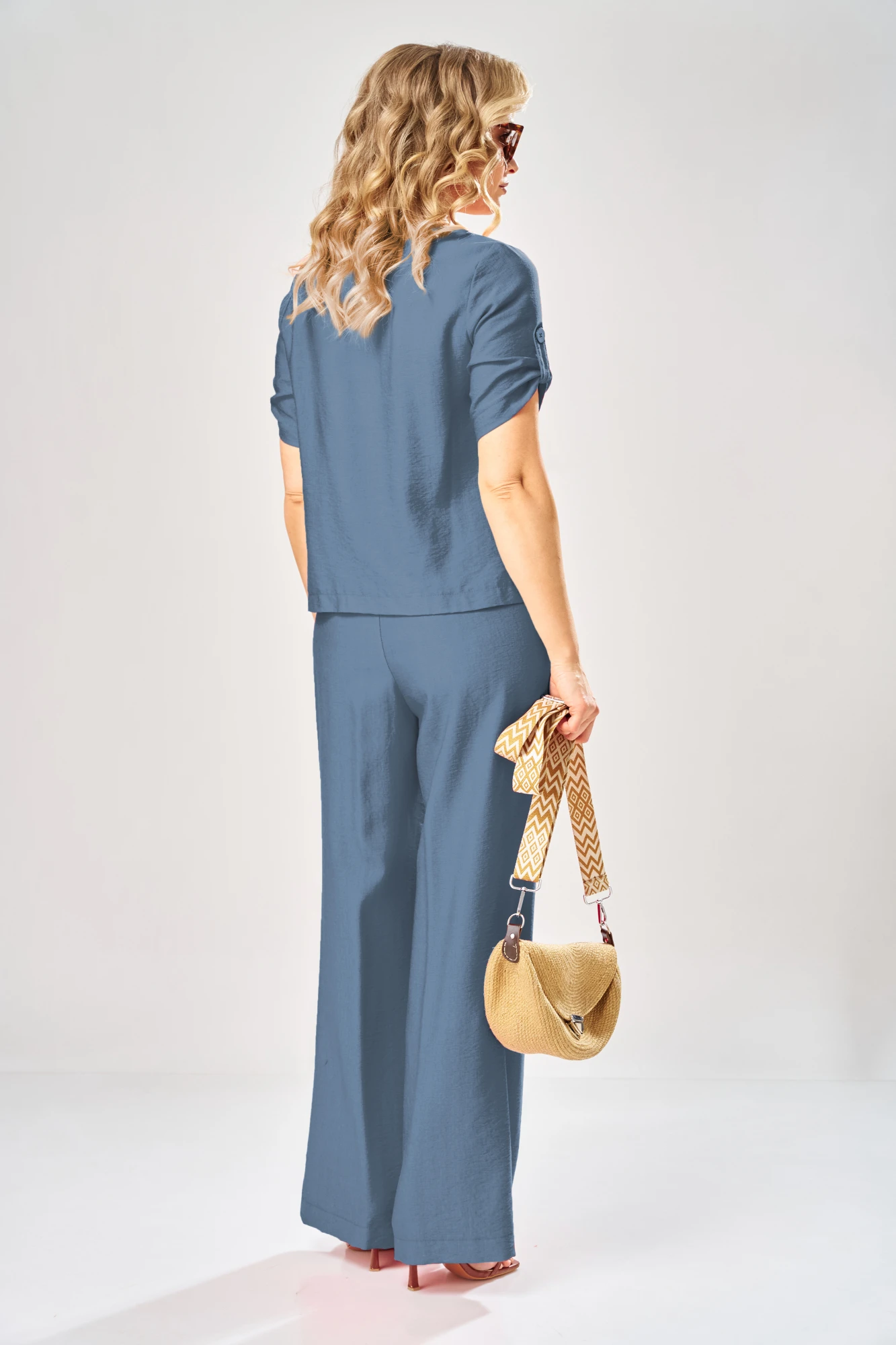 Комплект женский, состоящий из блузы и брюк, из текстильной ткани. Блуза прямого силуэта, вырез горловины округлой формы. Рукава втачнные, короткие, одношовные. По низу рукава обработан хлястик, застёгивающийся на одну прорезную петлю и пуговицу. Спинка без конструктивных элементов. Перед ассиметричный. С правой стороны нагрудная выточка, выходящая из бокового шва. С левой стороны рельеф с обработанной цельнокроеной планкой, заканчивающейся разрезом. На планке пришито 6 пуговиц. Брюки прямого силуэта, ассиметричные. С левой стороны на передних половинках брюк рельеф с обработанной цельнокроеной планкой, заканчивающейся разрезом. На планке пришито 7 пуговиц. На передних половинках брюк боковые карманы со скосом. Брюки с притачным поясом. Внутри пояса эластичная тесьма, и проложены две строчки. Длина блузы по спинке 60 см, длина рукава 30 см, длина брюк 111 см