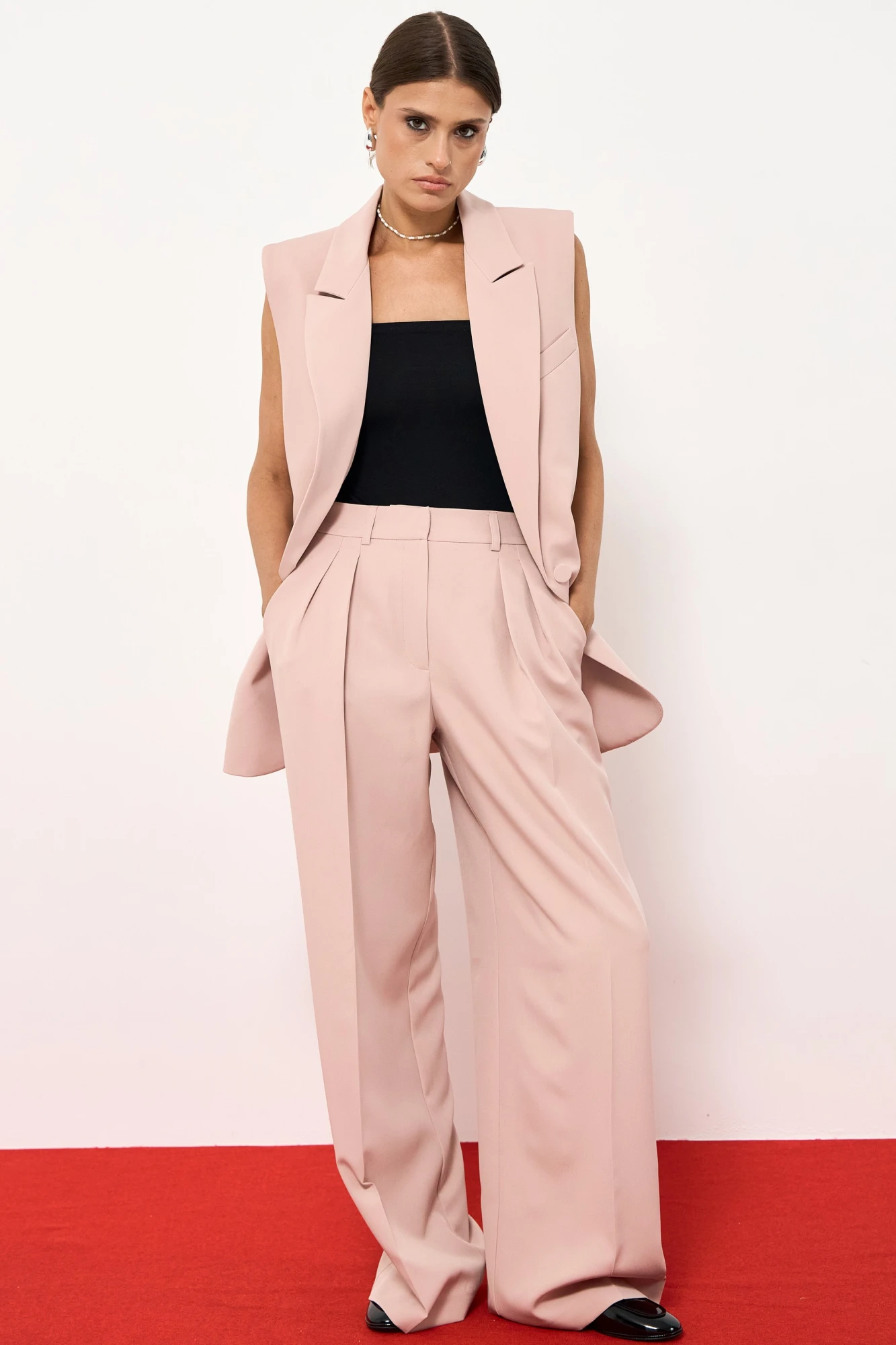 Комплект женский, жилет и брюки в костюмной однотонной ткани. Жилет прямого силуэта, однобортный, по переду застежка на пуговицу, по бокам клапаны и функциональные карманы. Плечи с подплечниками на кнопке, которые возможно снять и это не повлияет на изделие. Жилет на подкладке.