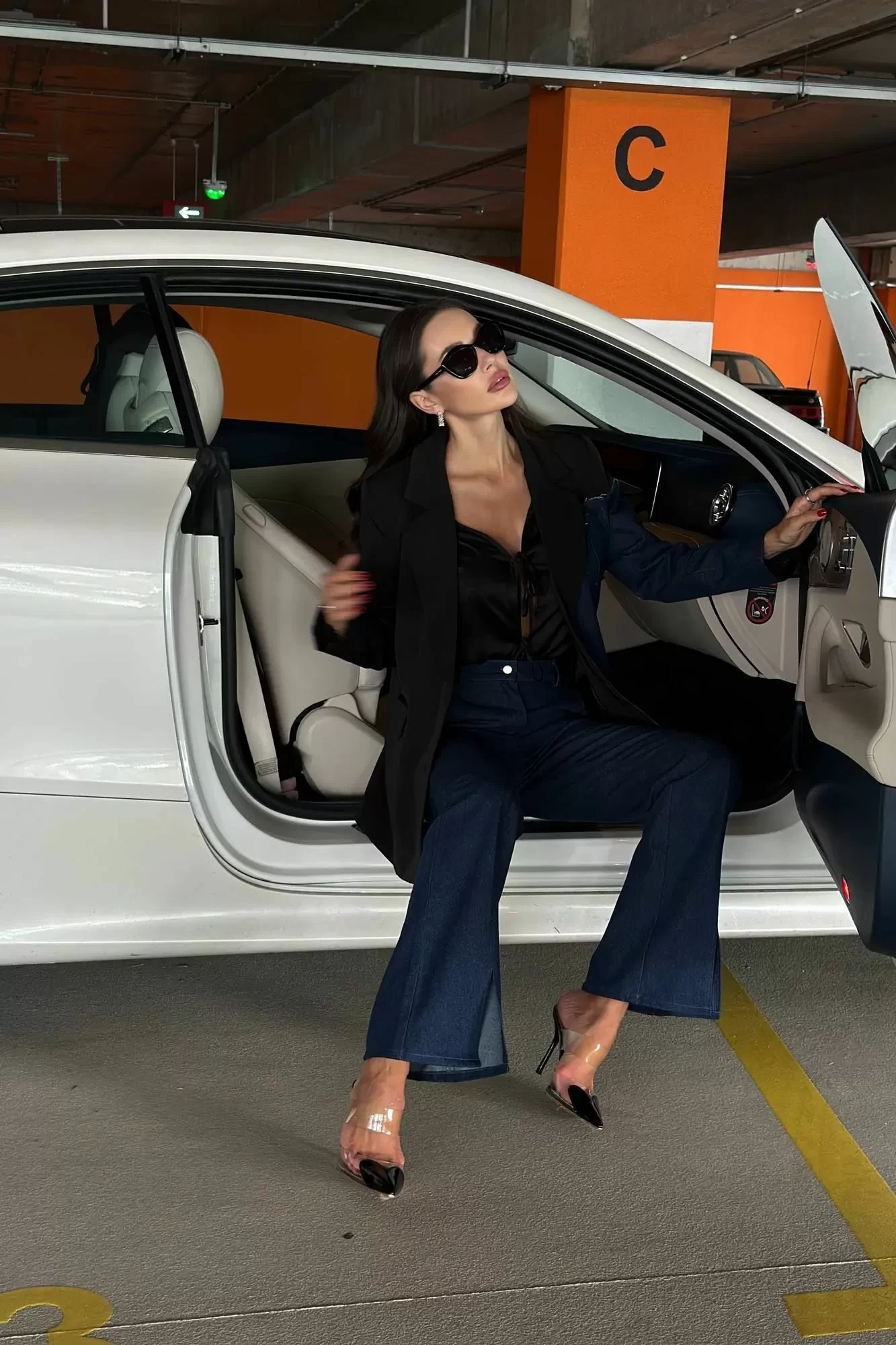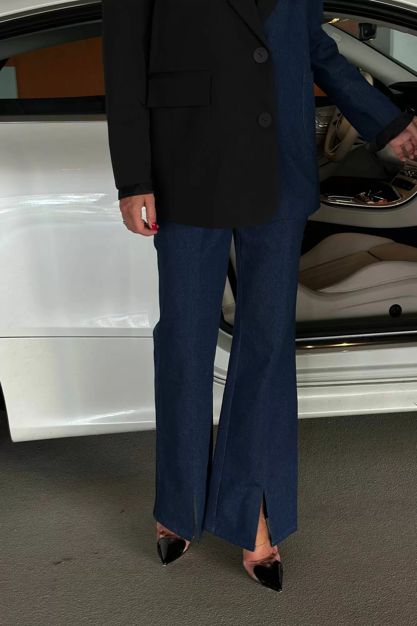 Костюм 2e[-предметный: жакет и брюки. Жакет однобортный прямого силуэта, на подкладке. По переду обработаны накладные карманы, а также пррорезной карман. Жакет выполнен из плотного денима, а таrже иp костюмной ткани. Брюки прямого силуэта, выполнены из плотного денима, с разрезами по переду. Застёжка - гульфик/