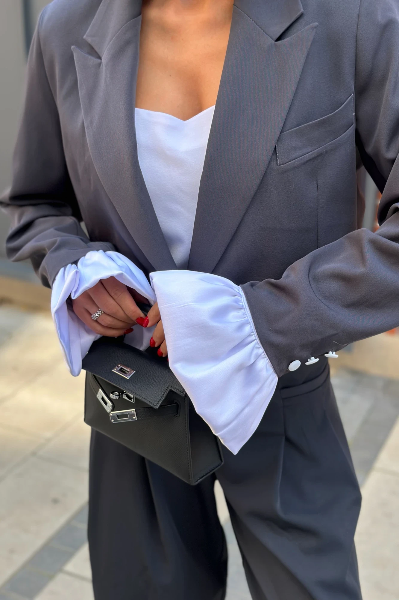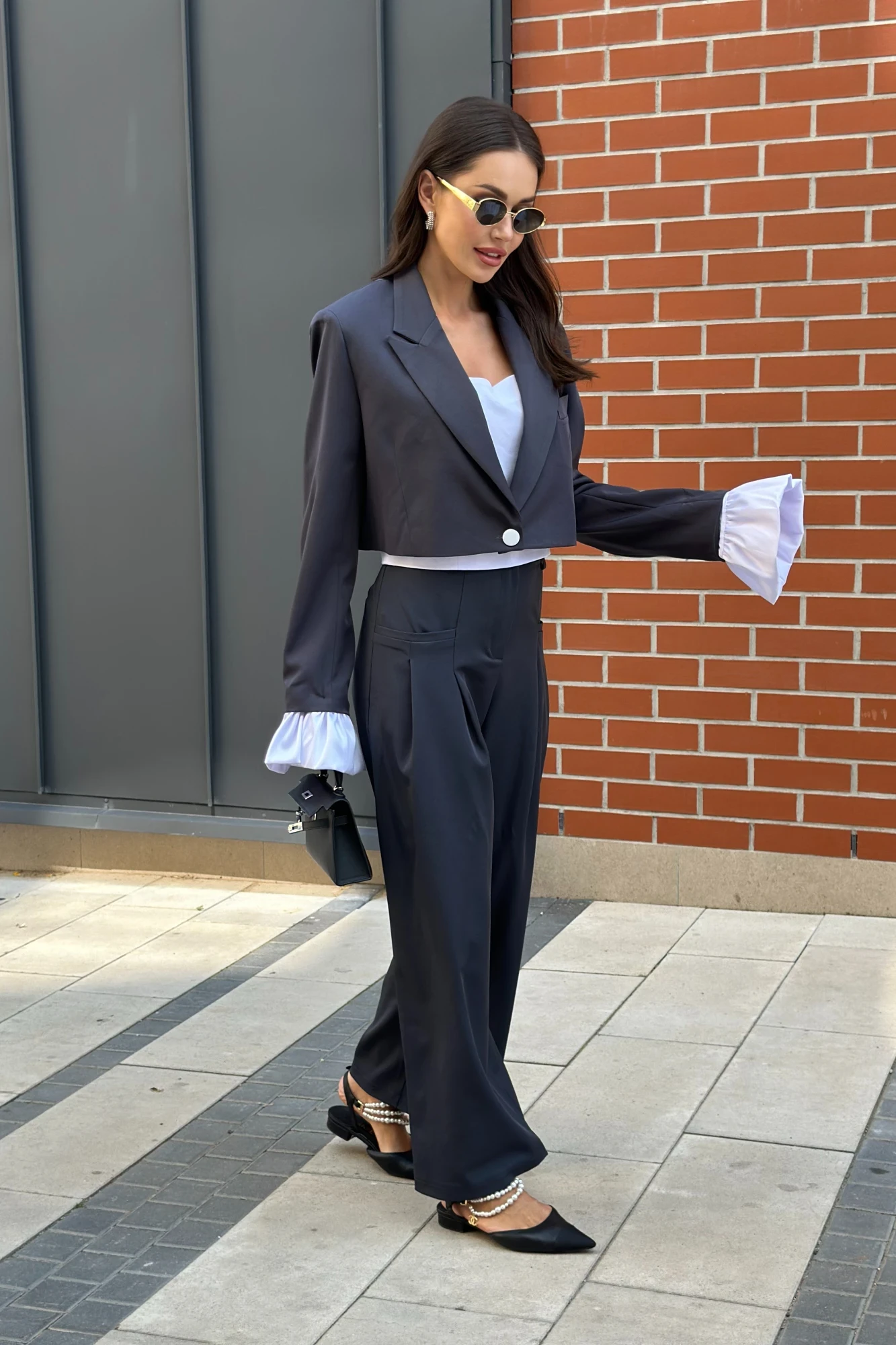 Однобортный жакет на подкладке, свободного силуэта. Рукава втачные одношовные, обработаны шлицей. Рукава обработаны съёмными деталями из атласной ткани. mБрюки широкие свободного силуэта. По передним половинкам обработаны глубокие прорезные карманы. Также обработаны складки по передним половинкам. Задние половинки также обработаны прорезными карманами. Застёжка -молния и пуговица.. Пояс притачной. Для ремня пришиты шлёвки по поясу изделия.