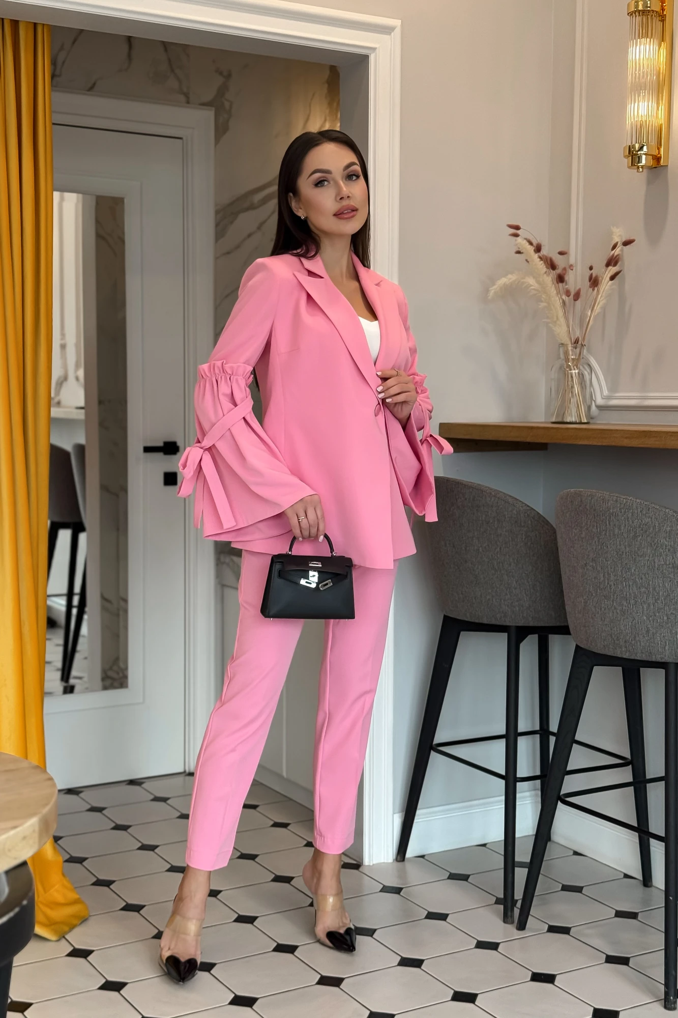 Жакет однобортный свободнго силуэта. Жакет обработан подкладкой. Рукав прямой, длинный, втачной, отрезной с пришитой присборенной деталью, шнурком из основной ткани для завязывания.