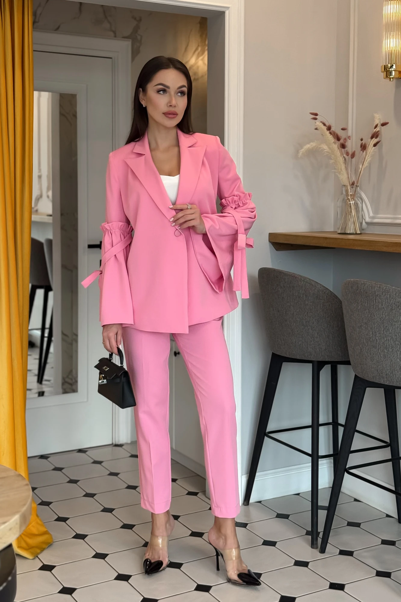 Жакет однобортный свободнго силуэта. Жакет обработан подкладкой. Рукав прямой, длинный, втачной, отрезной с пришитой присборенной деталью, шнурком из основной ткани для завязывания.