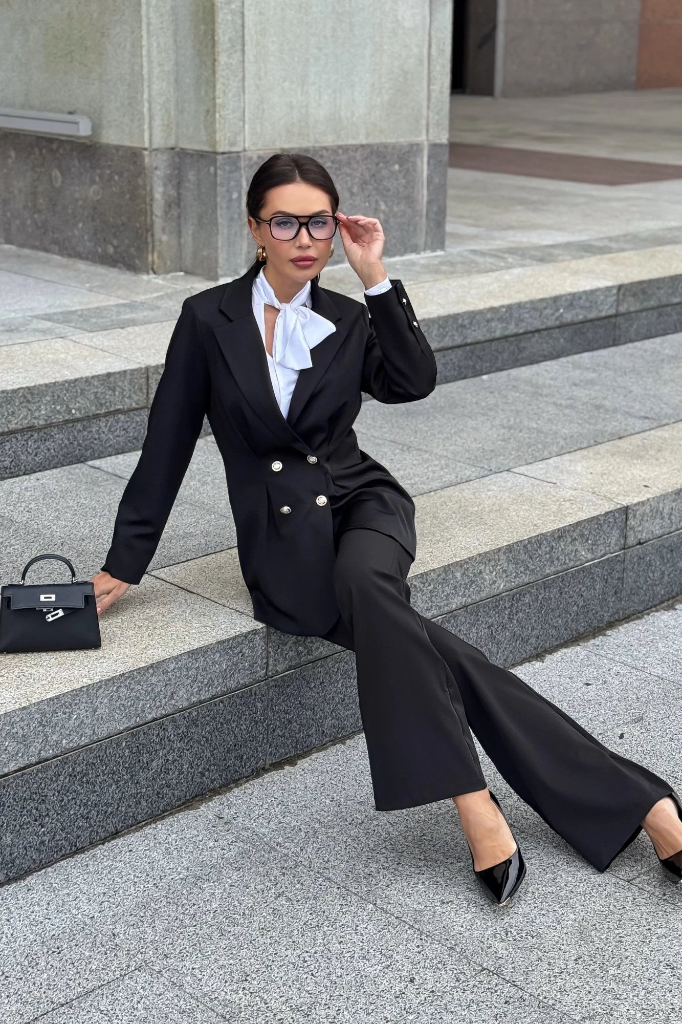 Комплект 2-х предметный. Состоит из жакета и брюк. Жакет однобортный, на подкладке, обработаны защипы на линии талии. Воротник костюмный, рукав втачной, прямой, лдношовный, обаботан шлицей. Фурнитура - пуговицы золотистого цвета. Брюки классические, по форме прямые, клешенные от лиии колена, застежка - потайная молния. Съёмный пояс из основной ткани, обработан пряжкой - в комплекте
