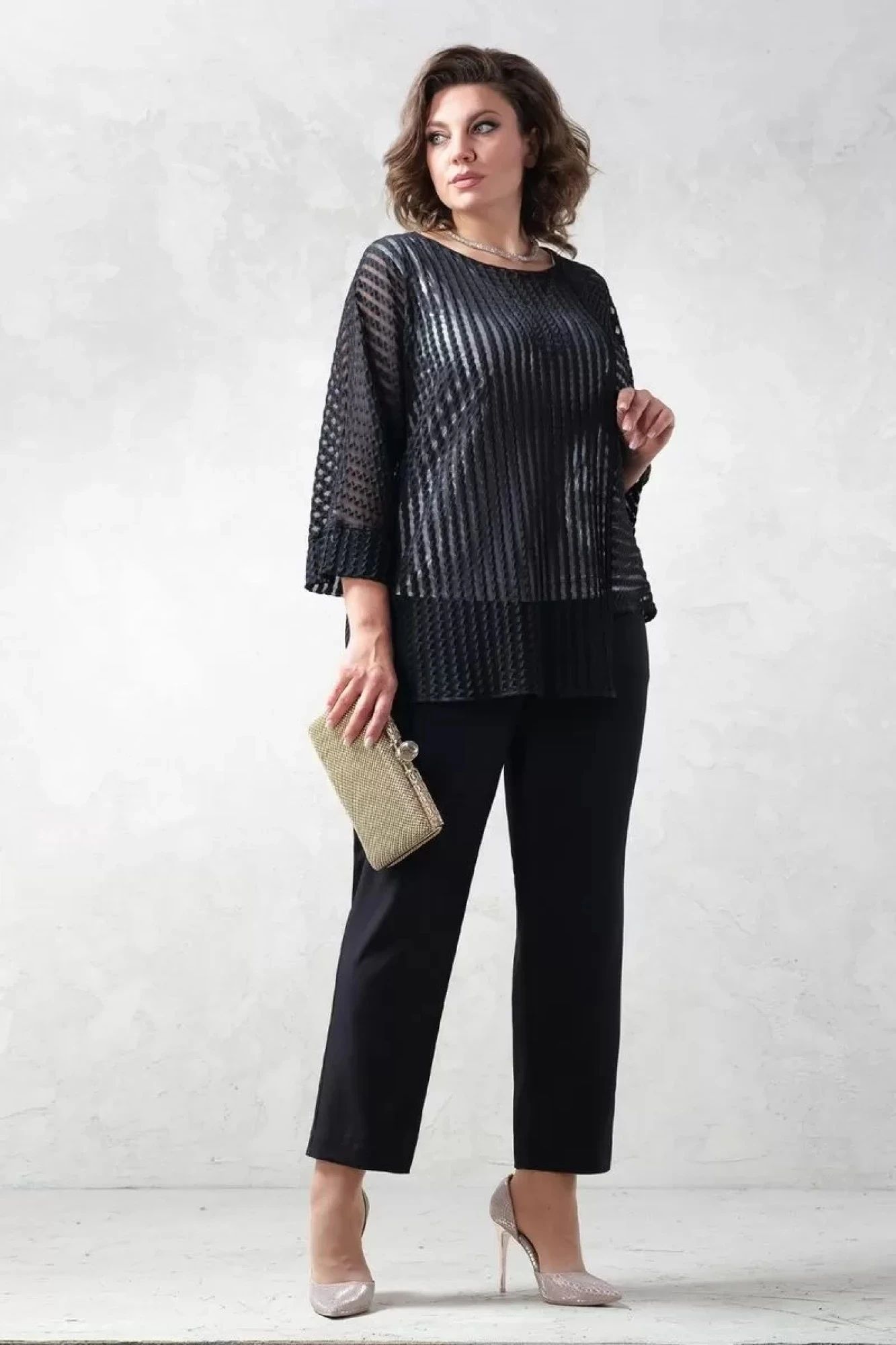 Комплект тройка: топ+блуза+брюки. Топ трикотажный. Ткань с матовым блеском. Длина по спинке 61 см. Блуза свободного кроя, ткань - тонкая прозрачная трикотажная сетка с кружевом. Рукав цельнокроеный. Длина блузы по спинке 62 см, рукав 3/4. Брюки классические. Ткань костюмно-плательная средней плотности, немного тянется. Застежка на молнию спереди, в боковых швах удобные карманы. Пояс на резинке. Длина изделия по боковому шву 101 см.
