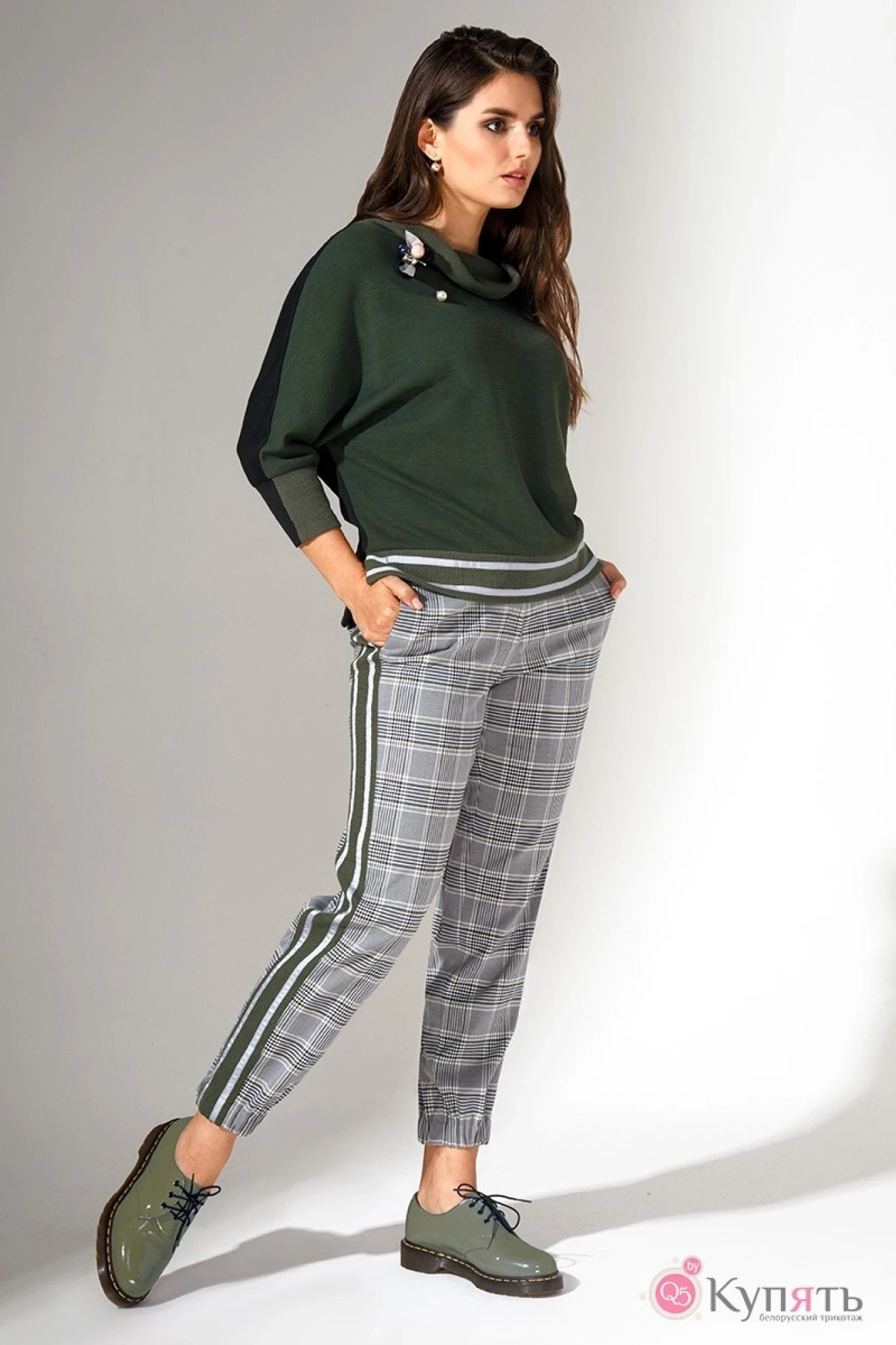 Комплект двойка: джемпер+брюки. Джемпер трикотажный, трикотаж мягкий, отлично тянется. Рукав 3/4, цельнокроенный. Брошь съемная, дизайн может изменяться взависимости от наличия на складе поставщика. Брюки из костюмно-плательной ткани средней плотности, немного тянется. На переде карманыв боковых швах, сзади накладные карманы. Низ брюк на резинке.