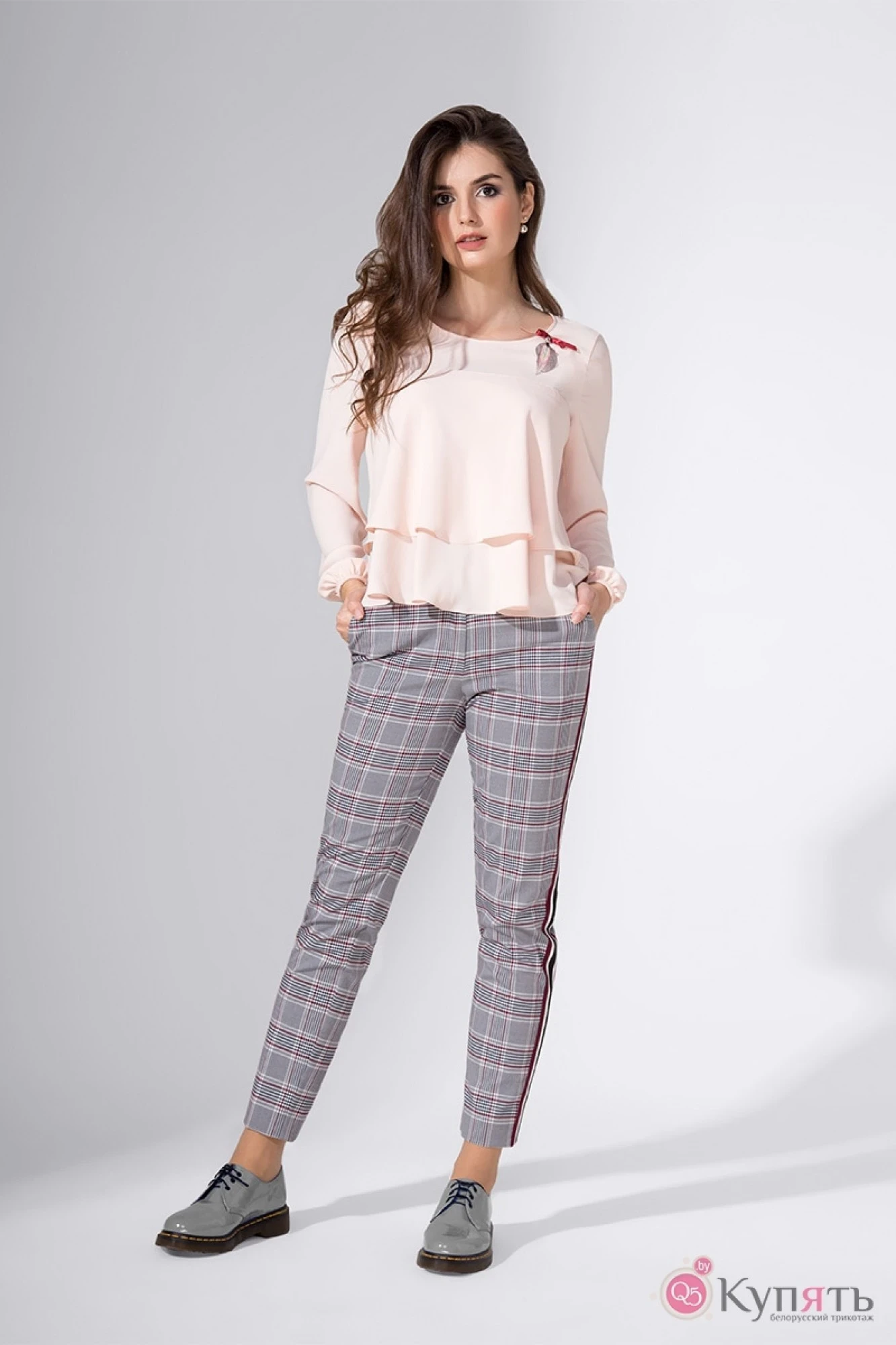 Комплект двойка: блуза+брюки. Блуза из легкой струящейся плательно-блузочной ткани, немного тянется. Низ рукава на резиночке. Брюки классические, застежка на молнию, на переде удобные карманы, ткань костюмно-плательная, немного тянется. Брошь в комплект не входит.