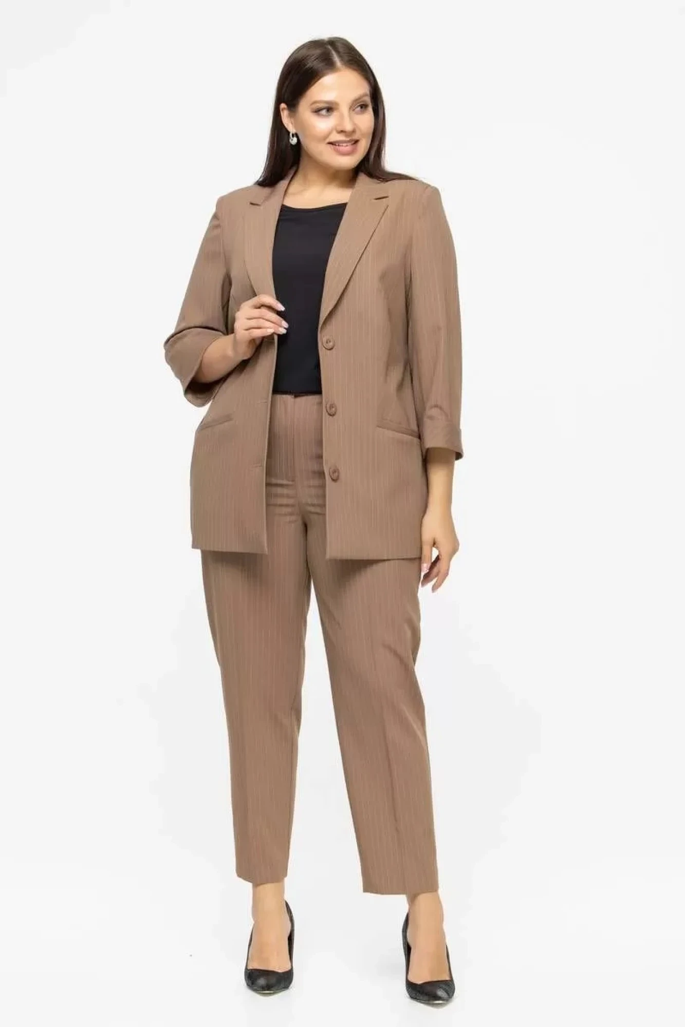 Классический костюм-двойка в полоску из текстильного полотна, состоящий из свободного жакета и брюк полуприлегающего кроя. Жакет застегивается на пуговицы. Идеальная посадка на фигуре и универсальный цвет позволяют выглядеть актуально и выразительно в любой ситуации.