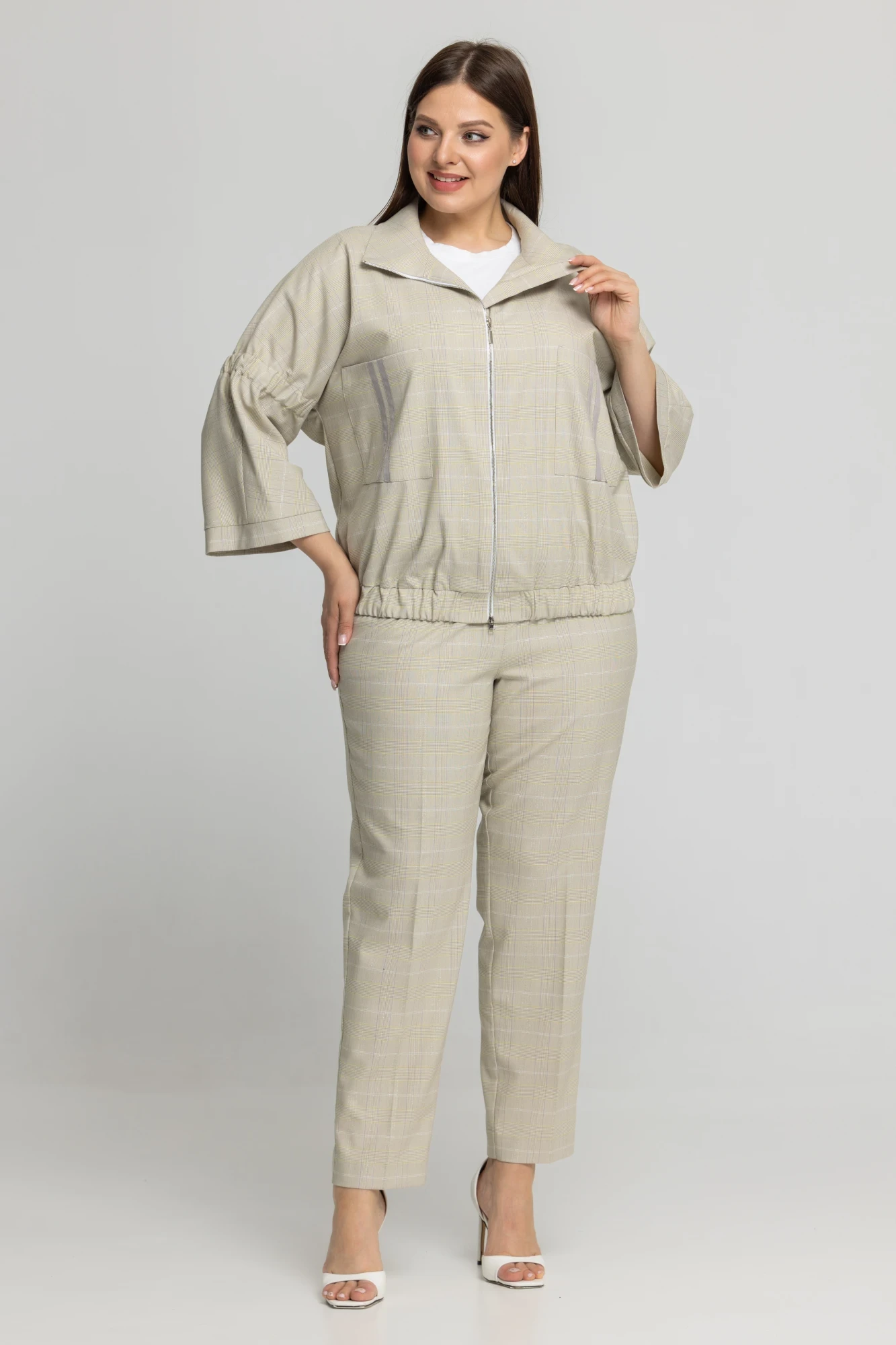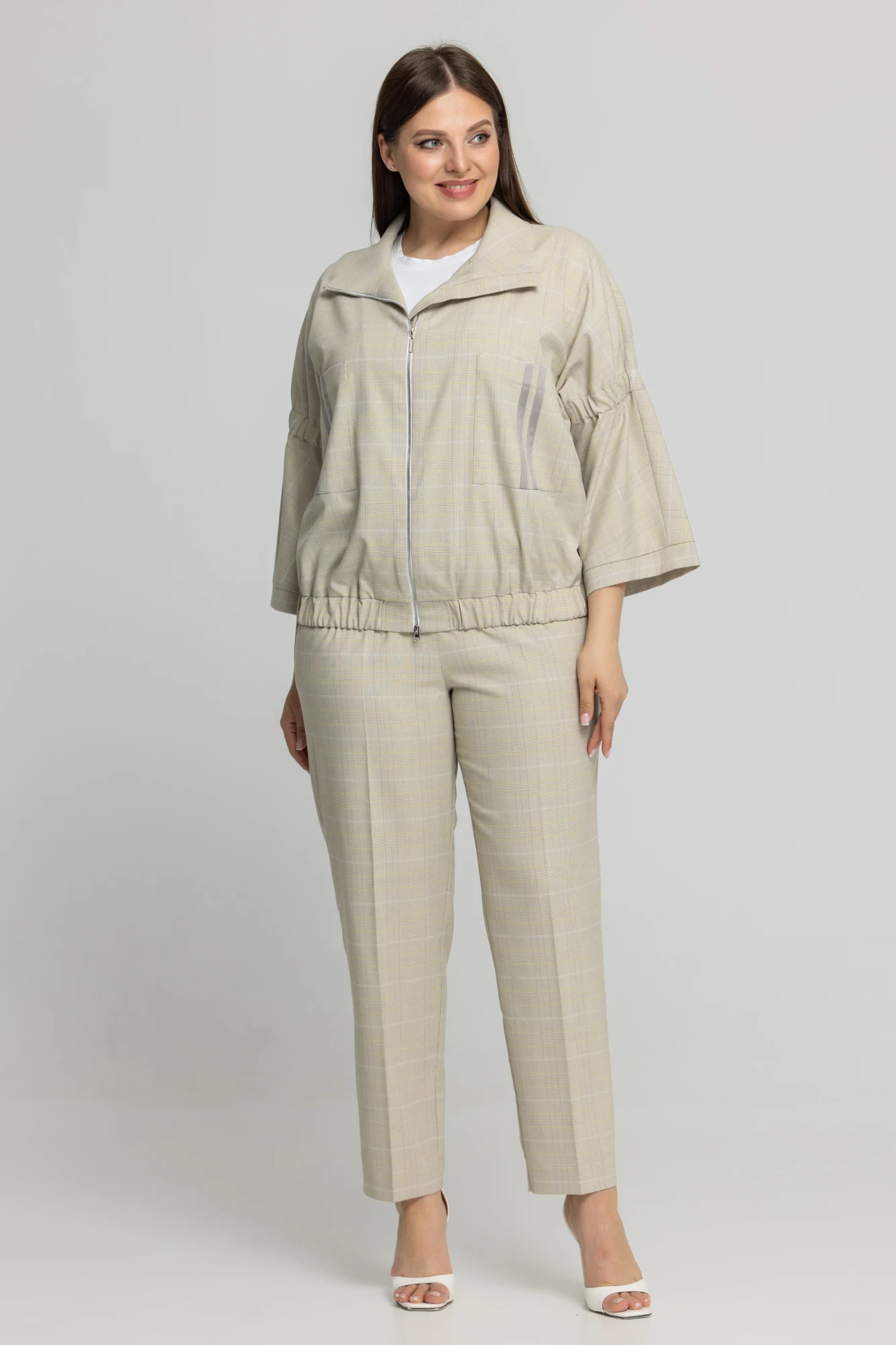 Костюм женский в стиле спорт-шик, состоящий из куртки бомбера и брюк. Куртка внизу на резинке, застегивается на замок. Рукав ниже локтя, в форме колокольчика. На бомбере накладные карманы, с декоративной тесьмой. Брюки в поясе на резинке со шнурком. Карманы в брюках прорезные. Очень удобный и комфортный женский костюм