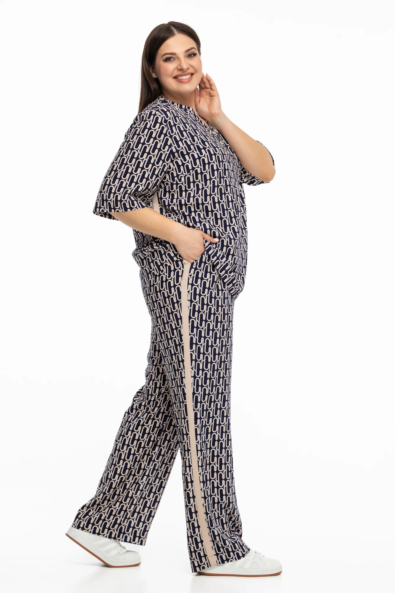 Костюм-двойка состоит из блузона и брюк свободного кроя. Модель стильная, подходит для повседневной носки, комплект станет отличным дополнением вашего гардероба.