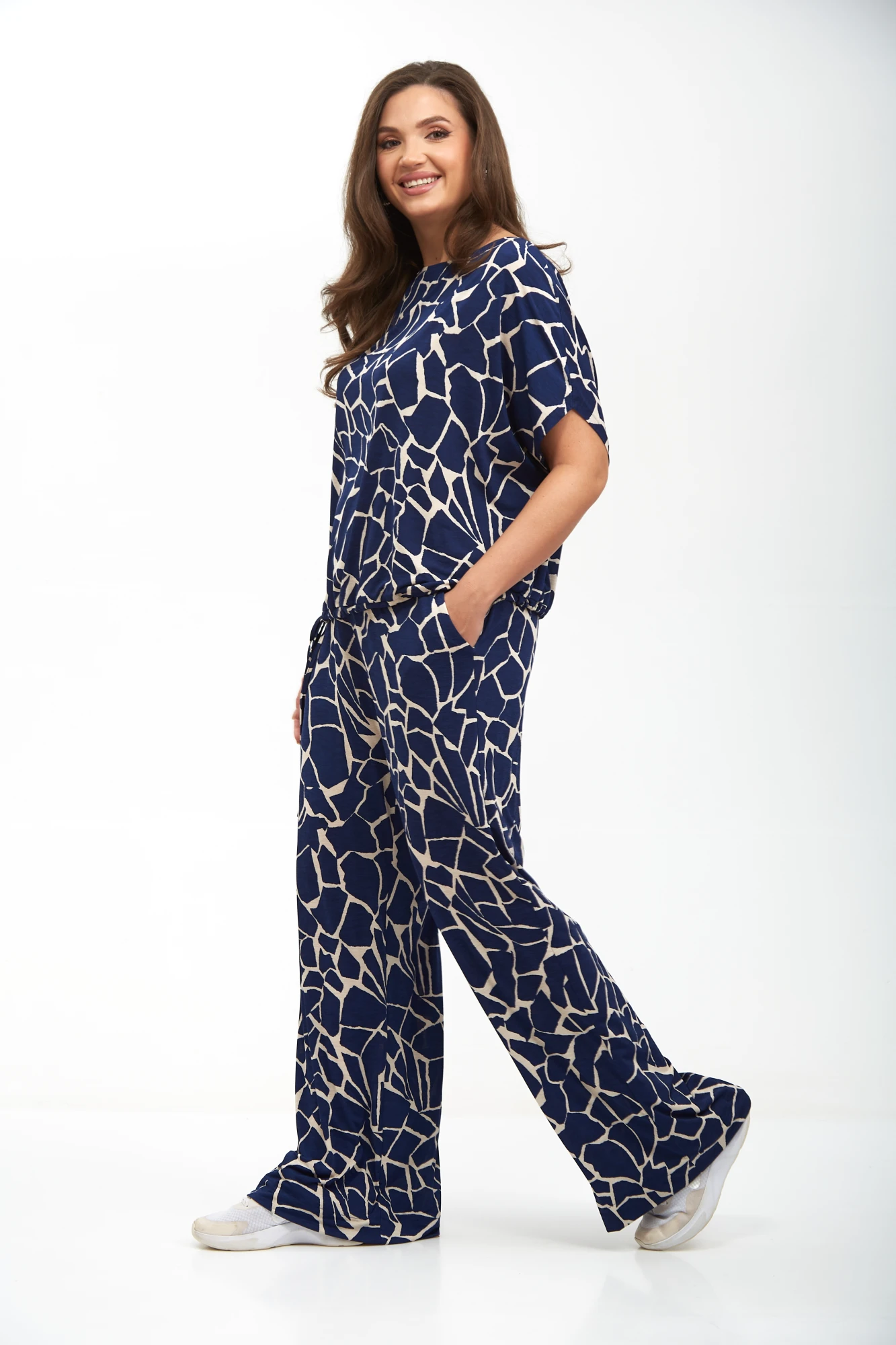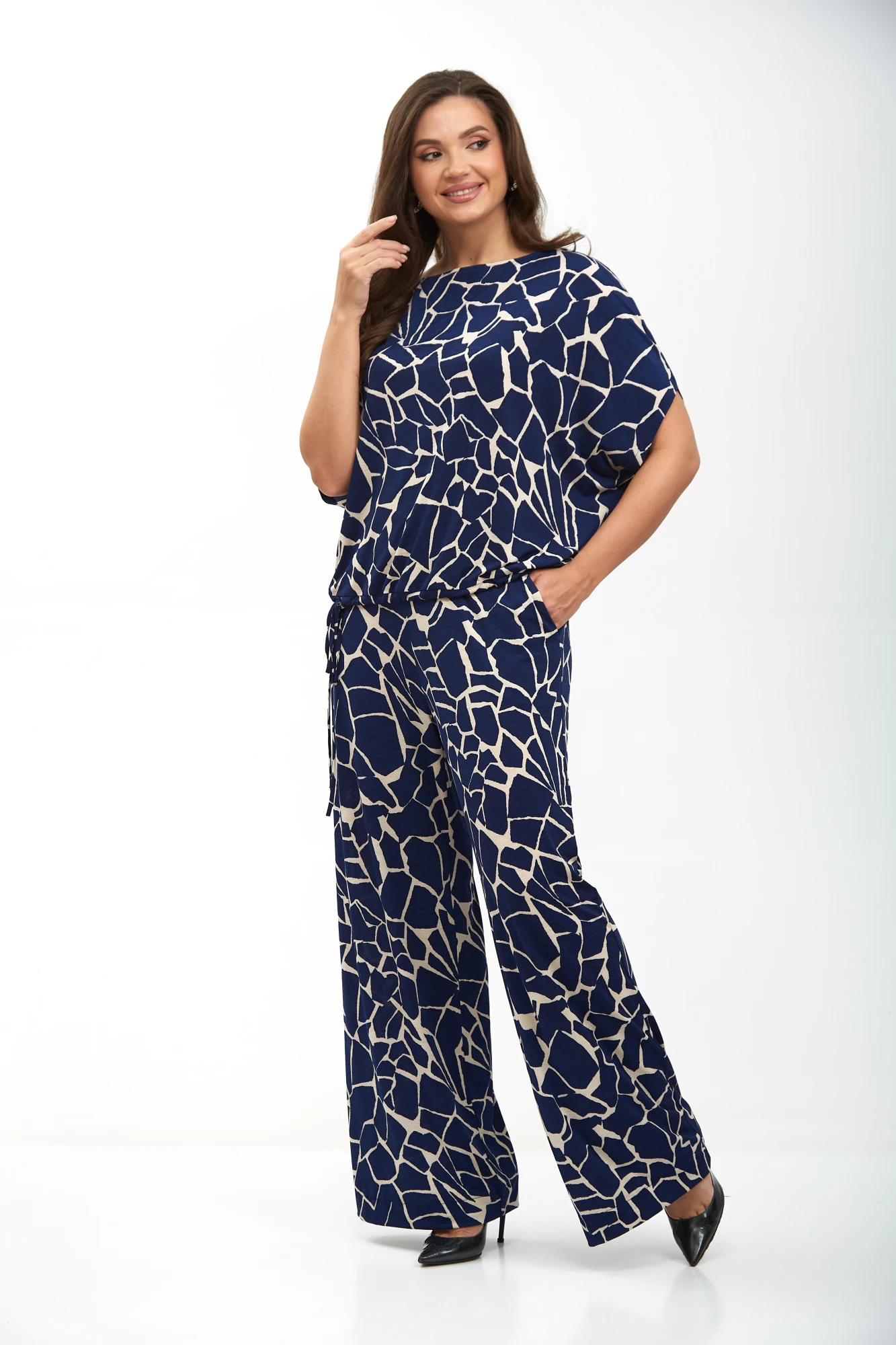 Брючный комплект в городском стиле от бренда АХХА идеально подойдет для тех кто ценит комфорт и стиль. Костюм свободного кроя выполнен из мягкой струящейся ткани, приятной к телу, в состав которой входит вискоза. Удобные свободные брюки с поясом на резинке идеально сидят на фигуре и визуально стройнят и вытягивают фигуру. В боковых швах брюк выполнены функциональные карманы. Блуза прямого силуэта, свободного кроя со спущенным плечом. Низ блузы обработан кулисой, что позволит Вам регулировать ширину блузы по низу, в зависимости от Ваших индивидуальных обхватов.