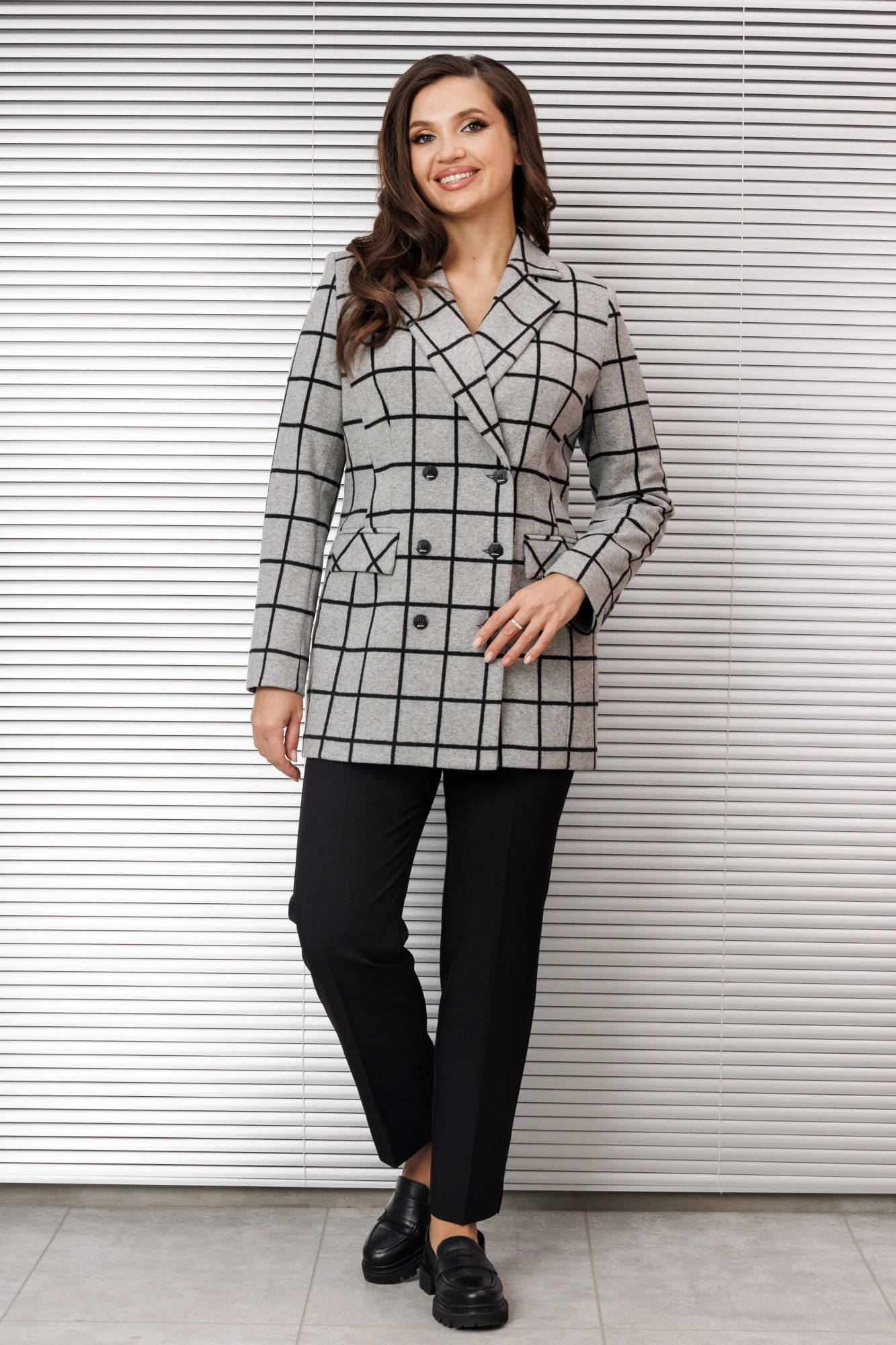 Комплект женский брючный, состоящий из жакета и брюк. Жакет из тёплой костюмной ткани с бархатистым ворсом, "в клетку", 2-бортный с застёжкой спереди на пуговицы, с отложным воротником, по переду карманы с клапанами,полуприлегающий, удлинённый, Изделие на подкладке. Брюки на поясе- кокетке с эластичной тесьмой по задней части пояса, с имитацией застёжки, зауженные к низу с разрезиками в боковых швах.