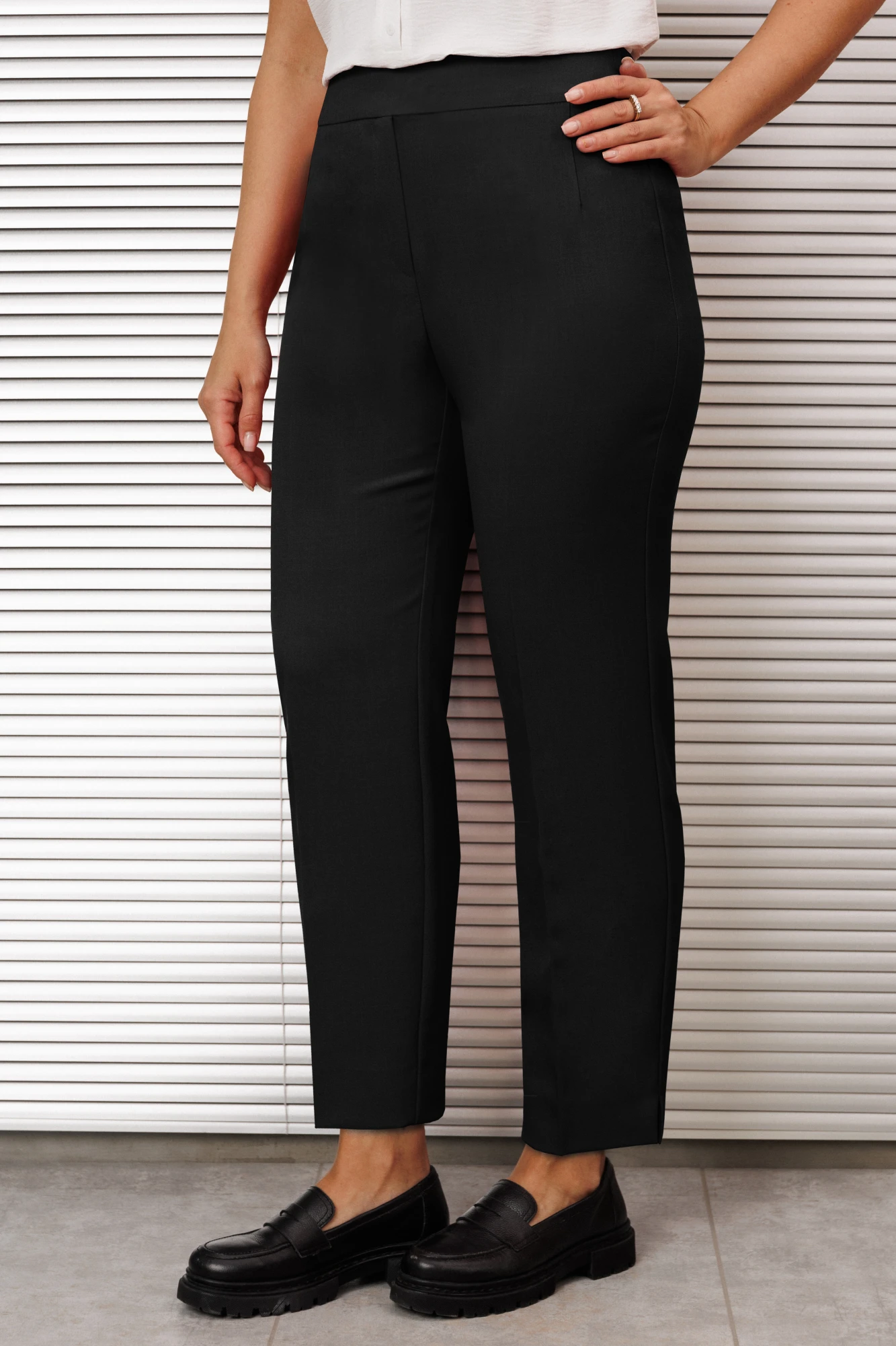 Комплект женский брючный, состоящий из жакета и брюк. Из однотонной ткани. Жакет полуприлегающего силуэта,с втачным рукавом со шлицей по низу рукава, застёжка спереди на пуговицы. По переду карманы с клапанами, воротник отложной с лацканами. Изделия на подкладке. Брюки на поясе-кокетке с эластичной тесьмой по задней части пояса, зауженные к низу с разрезиками в боковых швах, с имитацией застёжки.