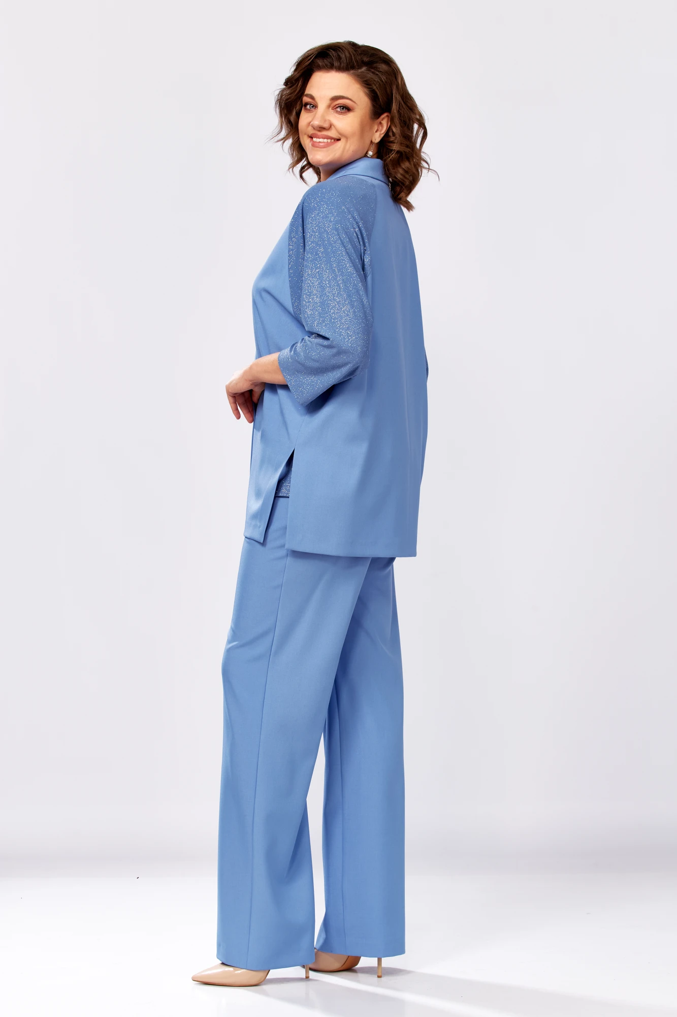 Комплект женский брючный,состоящий из жакета, брюк и джемпера. Жакет свободного покроя,комбинированный из однотонной ткани и тонкого трикотажа с лёгким блеском под пояс. Воротник отложной с лацканами, рукав 3/4 длины. Брюки прямые,свободные с боковыми карманами, по поясу с эластичной тесьмой. Джемпер из трикотажа со спущенной проймой, без рукава,свободный, слегка облегающий фигуру.