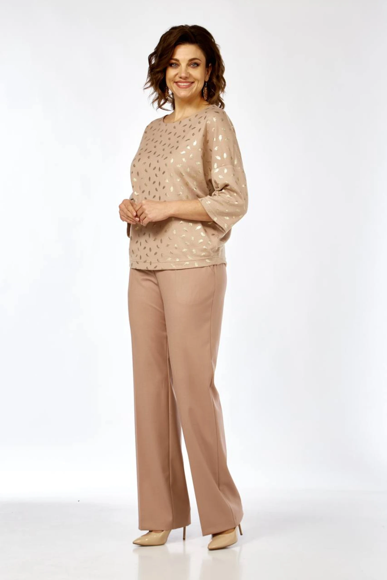 Комплект женский,состоящий из джемпера и брюк. Джемпер из трикотажного полотна с дизайном "золотые перья", со спущенной проймой, с рукавом 3/4 длины, вырез горловины полукруглый. Брюки из однотонной костюмной ткани, прямые, свободные, со стрелками, с карманами, с резинкой по спинке.