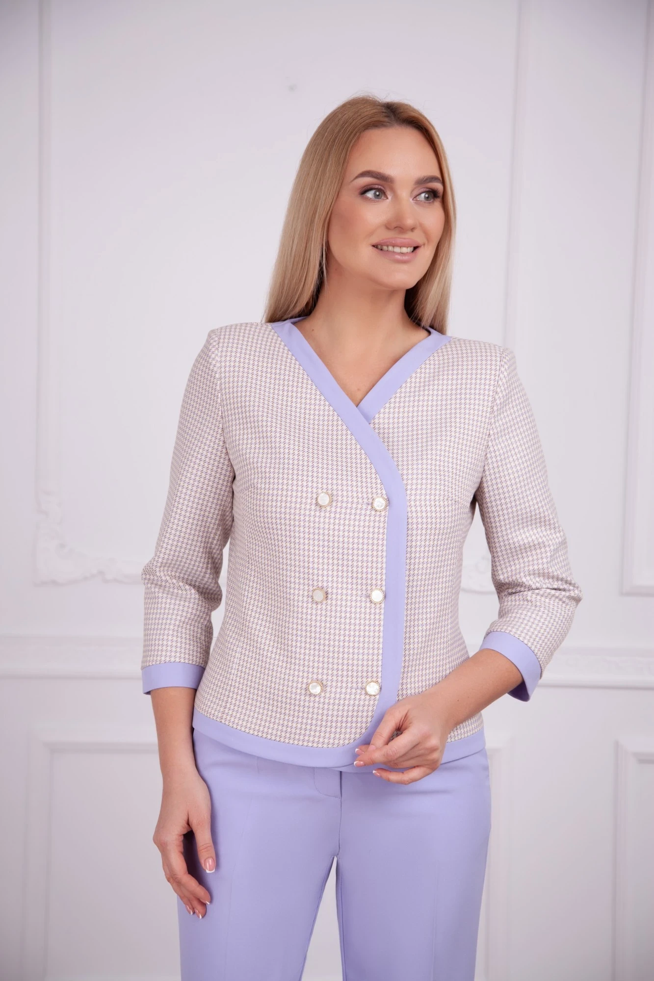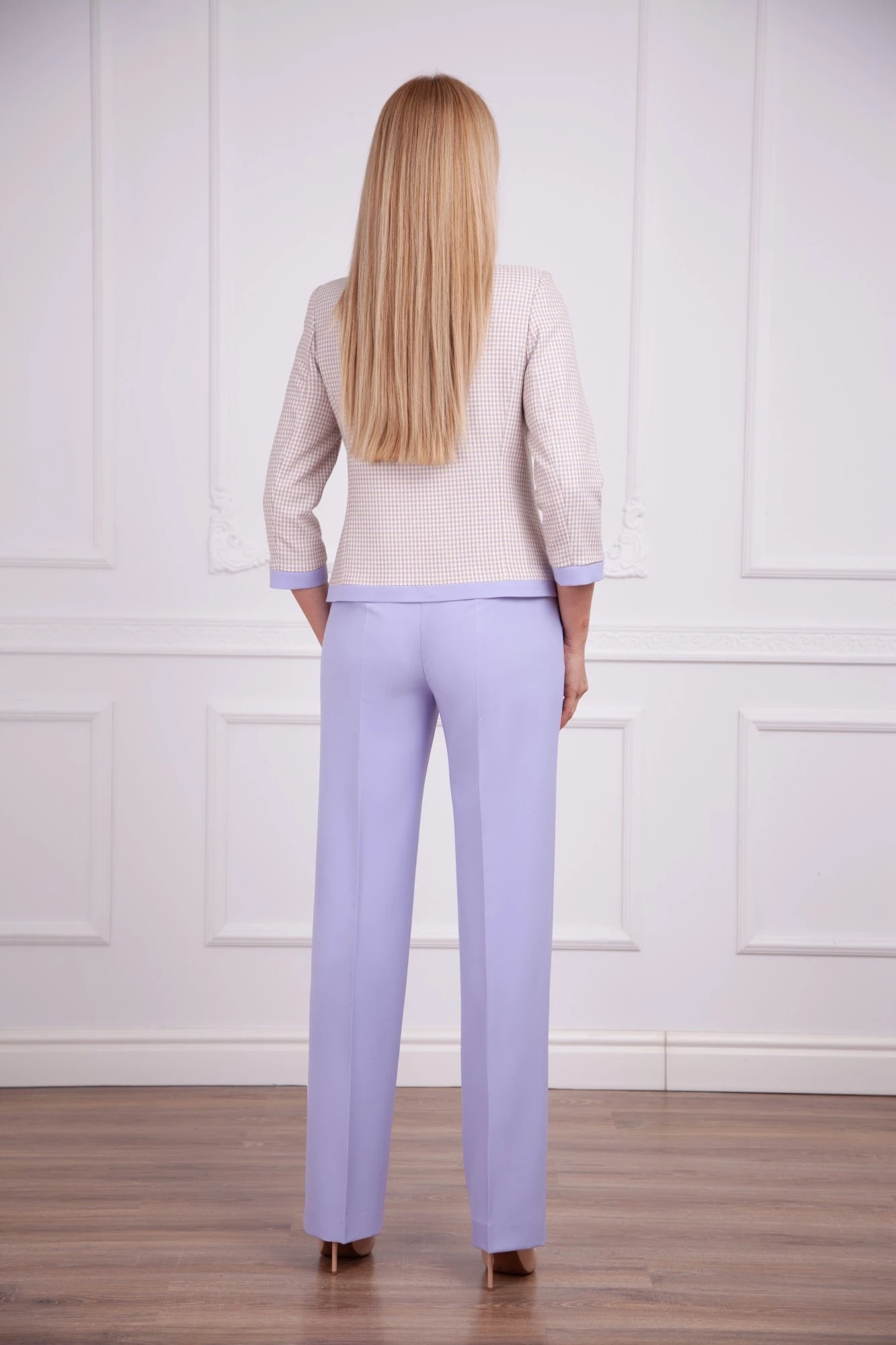 Комплект женский брючный ,состоящий из жакета и брюк из разных видов ткани . Жакет прямого силуэта ,2-бортный без воротника ,с втачным ¾ рукавом ,с отделкой из однотонной ткани по планкам борта ,жакет на подкладке. Брюки из однотонной ткани на поясе –кокетке ,широкие со стрелками ,с боковыми карманами .