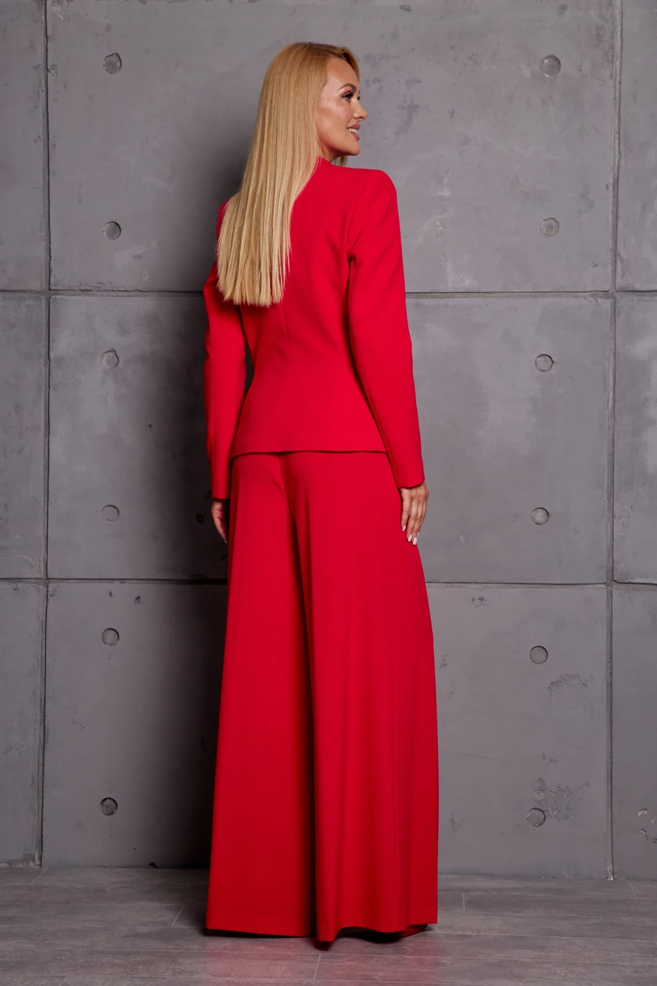 Комплект женский брючный, состоит из жакета и брюк. Жакет укороченный, прилегающего силуэта, воротник отложной с лацканами, рукав втачной, застёжка спереди на петли и пуговицы, по переду карманы с клапанами "обманка", по спинке рельефы и средний шов, изделие на подкладке. Брюки широкие со складками от пояса, застёжка спереди на молнию и пуговицы, с боковыми карманами.