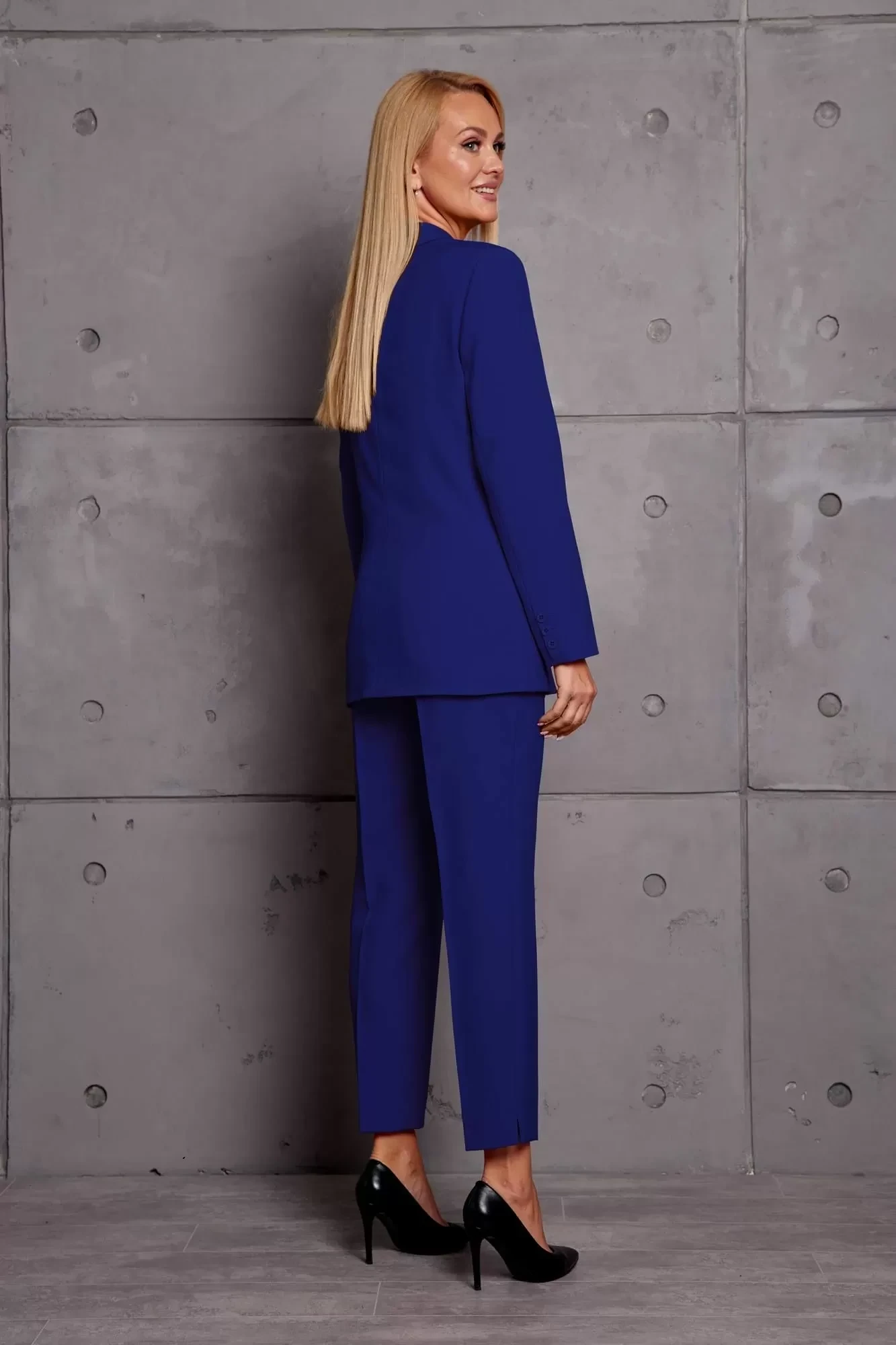 Комплект женский брючный, состоящий из брюк и жакета. Жакет полуприлегающего стлуэта с втачным рукавом, воротник с шалью, застёжка спереди на петли и пуговицы. По переду прорезные карманы с листочками. Изделие на подкладке. Брюки 7/8 длины, зауженные к низу, на поясе- кокетке с застёжкой спереди на молнии и пуговицы. По спинке - пояс с эластичной тесьмой.