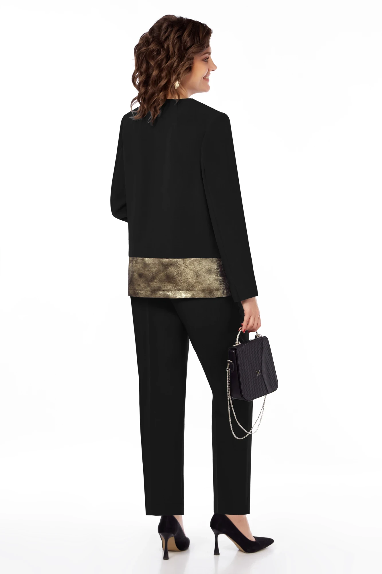 Нарядный женский трехпредметный комплект состоит из жакета и брюк, выполненных из плательно-костюмной ткани и топа ,выполненного их лёгкой ткани с золотым принтом.