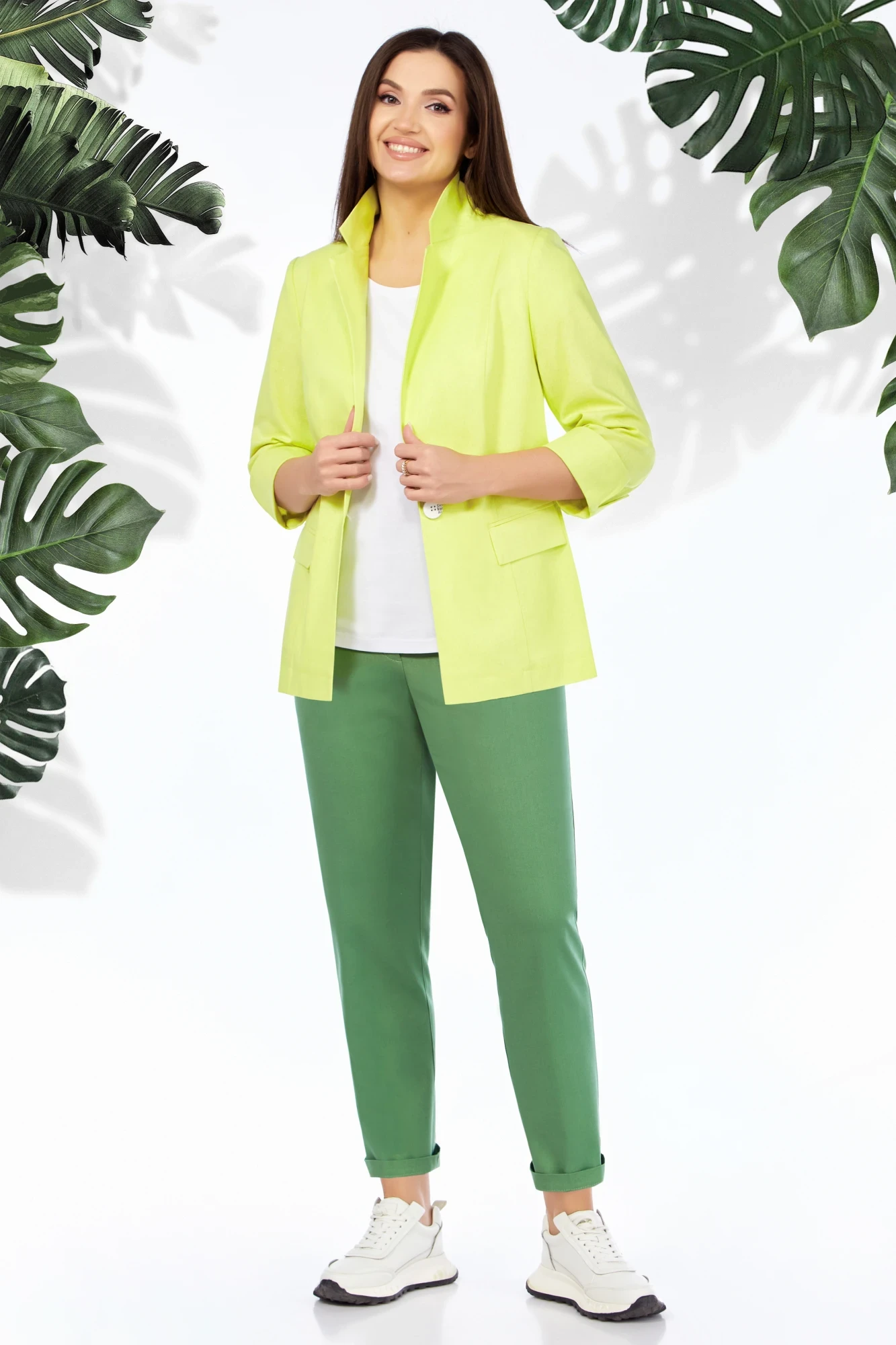 Женский трёхпредметный комплект, состоит из жакета и брюк, выполненных из плательно-костюмной ткани с содержанием натурального льна и вискозы,но разных цветов,и майки, выполненной из трикотажного полотна кулирная гладь.