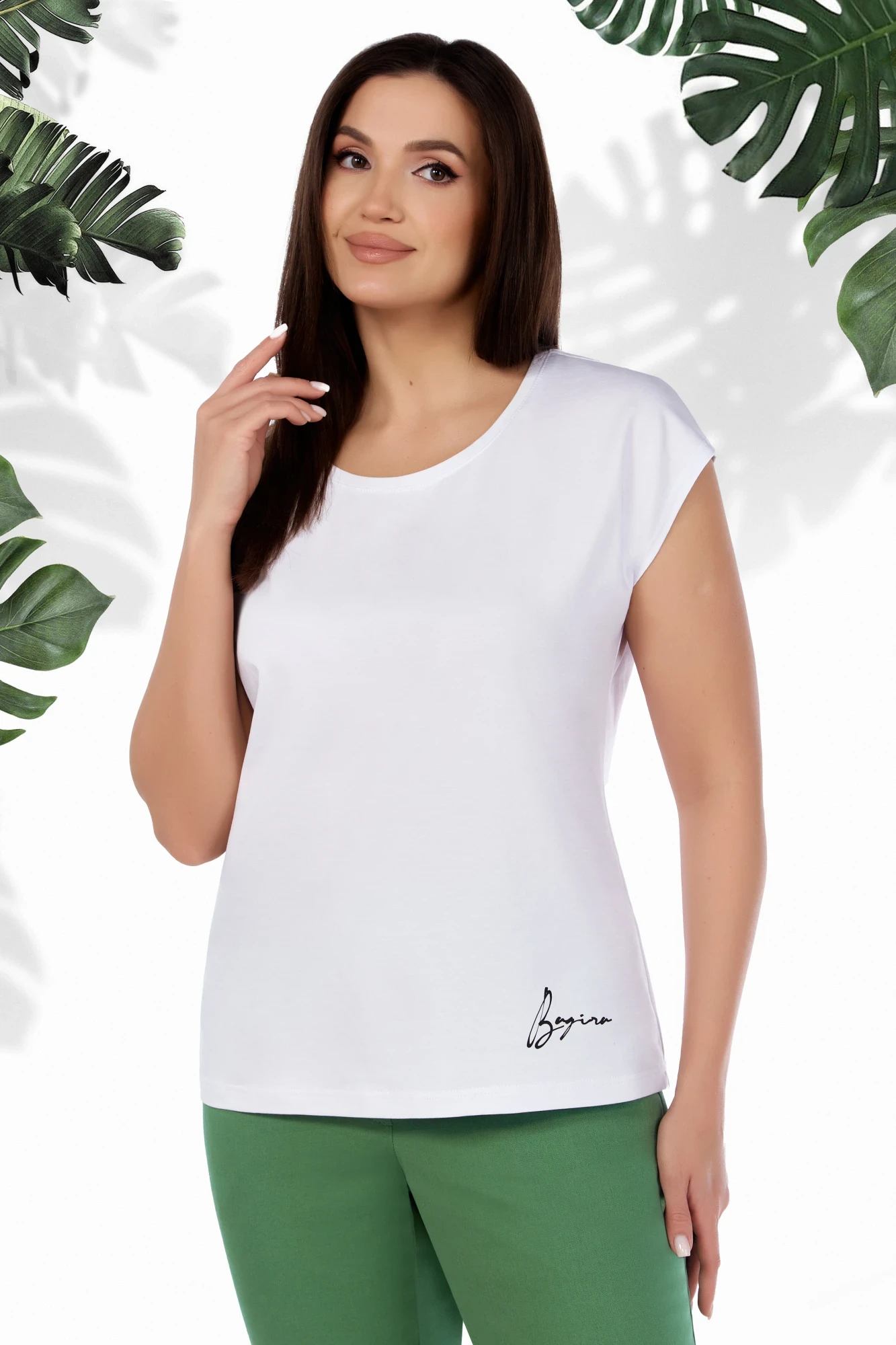 Майка прямого силуэта,со спущенной линией плеча,средним швом по спинке.В нижней левой части переда выполнена дизайнерская печать.