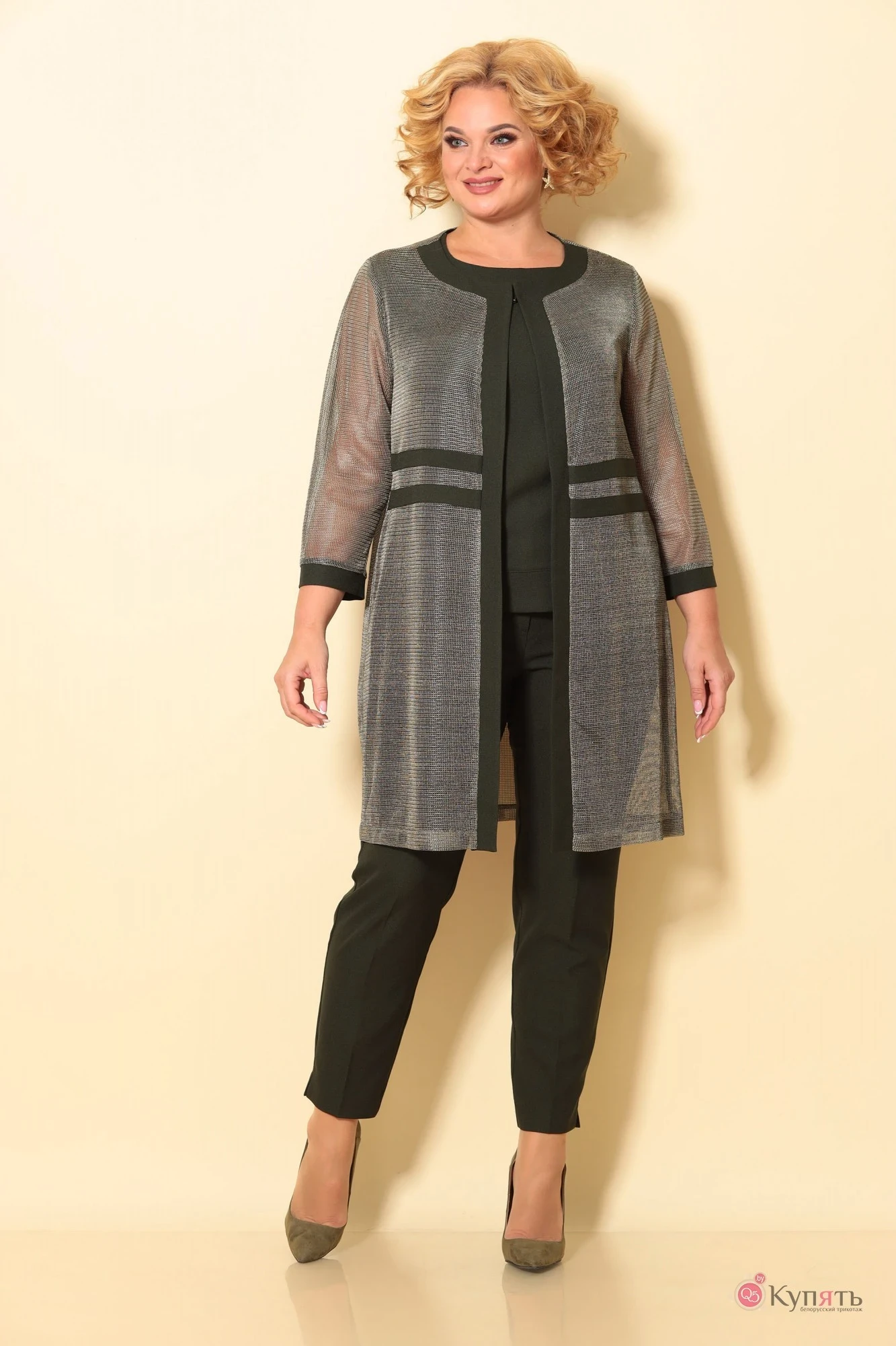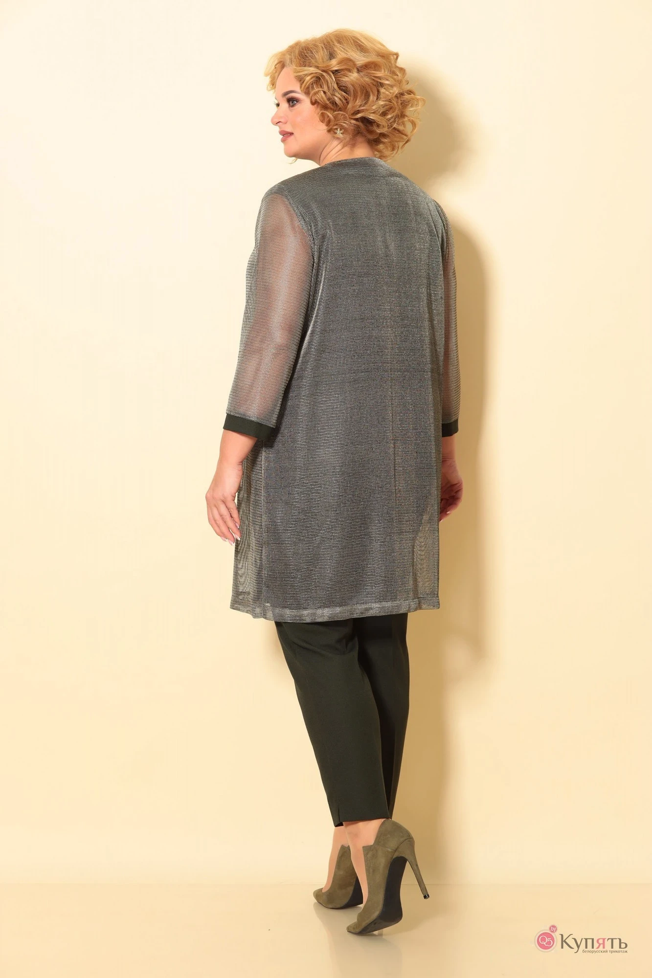 Комплект женский, трехпредметный. Накидка прямого силуэта, спинка цельнокроенная. Перед с притачной планкой и настрочными отделочными деталями. Рукав втачной одношовный с притачной манжетой по низу. Топ полуприлегающего силуэта. Пройма и горловина обработаны обтачкой. По низу топа разрезы по бокам. Брюки полуприлегающего силуэта. По линии талии притачной пояс-кокетка. На передней части брюк - наклонный прорезной карман. Застежка-молния в переднем центральном шве и две пуговицы на поясе. На задней части брюк обработаны прорезные листочки. Низ брюк заканчивается разрезом по боковому шву.