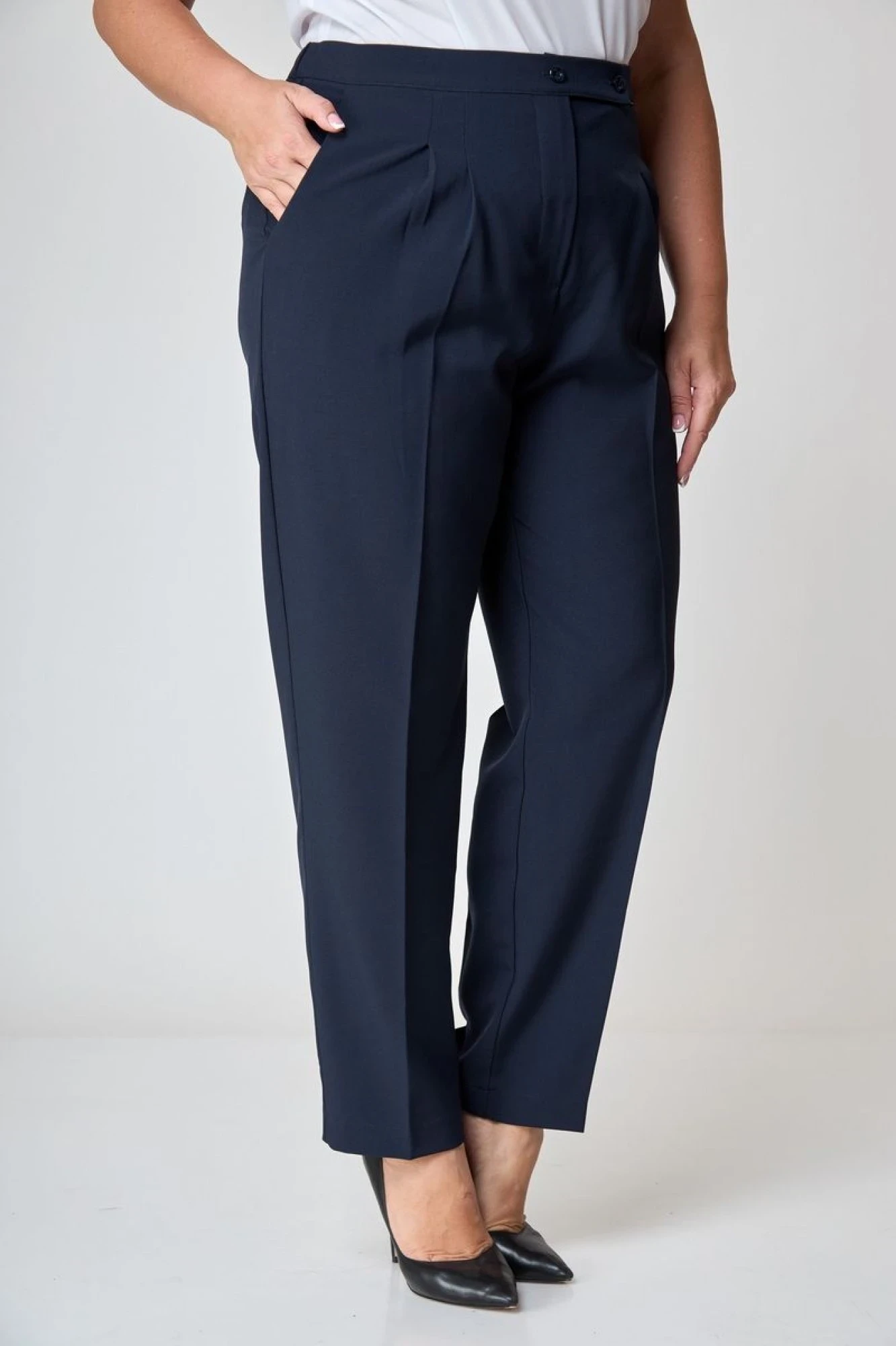 Костюм женский полуприлегающего силуэта. Спинка без среднего шва, с отрезным бочком переходящим на перед. Перед с нагрудной вытачкой, прорезными карманами "листочка" и клапанами. Застежка центрально-бортовая на 3 пуговицы. Воротник отлажной с лацканами. Рукав втачной двухшовный по низу со шлицей, закрепляющийся на пуговицы. Жакет выполнен на подкладке. Брюки классические с наклонными карманами и складками по передней половинке. Задняя половинка с прорезными листочками. Пояс притачной, со стороны задней половинки предусмотрена эластичная тесьма. Застежка в среднем шве на тесьму-молнию и пуговицы на поясе.
