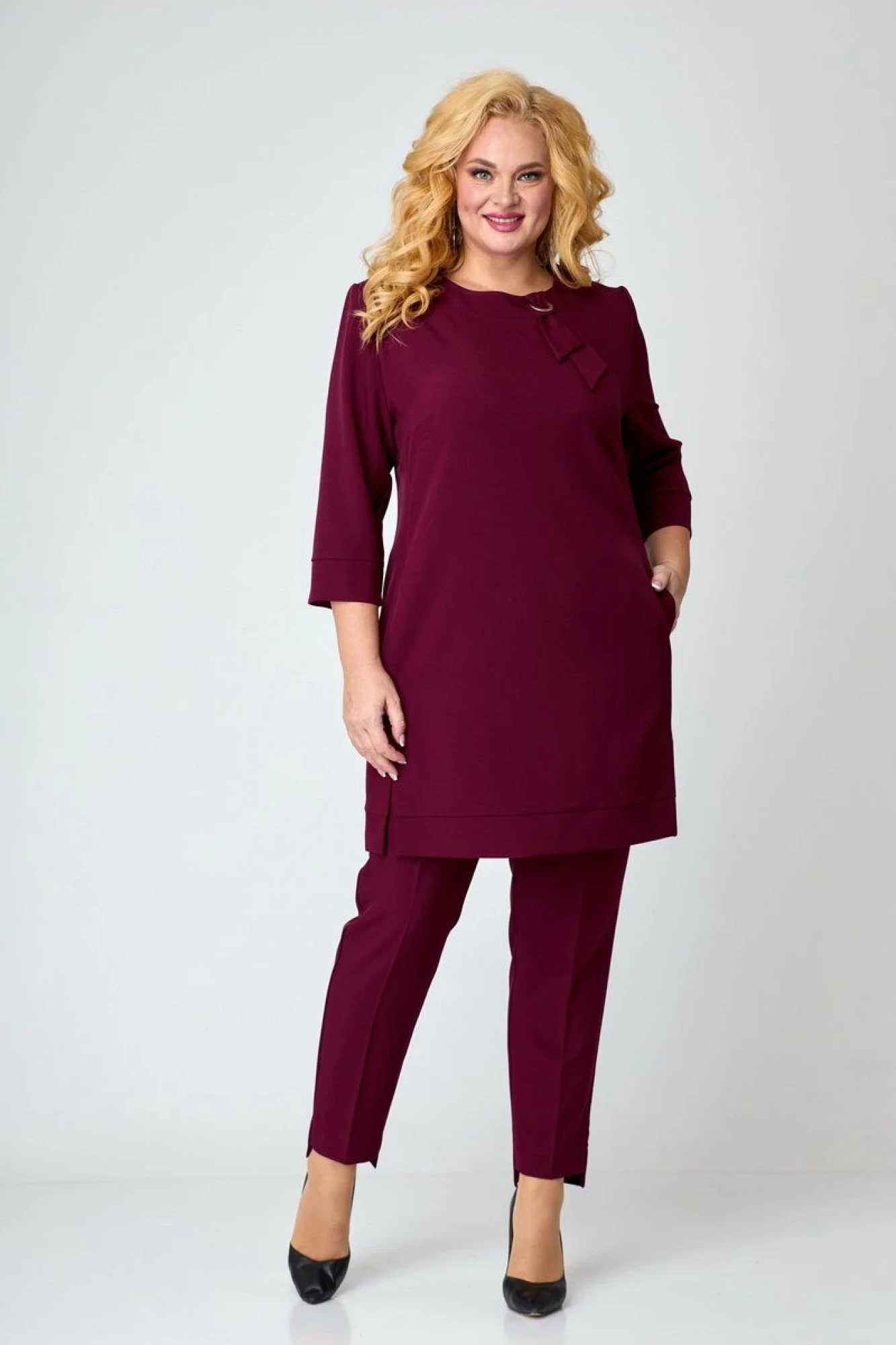 Костюм женский, полуприлегающего силуэта, состоящий из туники и брюк. Туника-спинка со средним швом, перед цельнокроенный с нагрудной вытачкой от рельефа бочка. В рельефном шве бочка по переду обработан функциональный карман. Рукав втачной одношовный. По низу туники и низу рукава притачные манжеты. Горловина с притачной планкой и декоративными элементами в виде люверса и галстука протянутого через люверс. Брюки классические, слегка заужены к низу. Пояс притачной с частичной вставкой эластичной тесьмы. Низ брюк ассиметричного решения с разрезами по бокам.