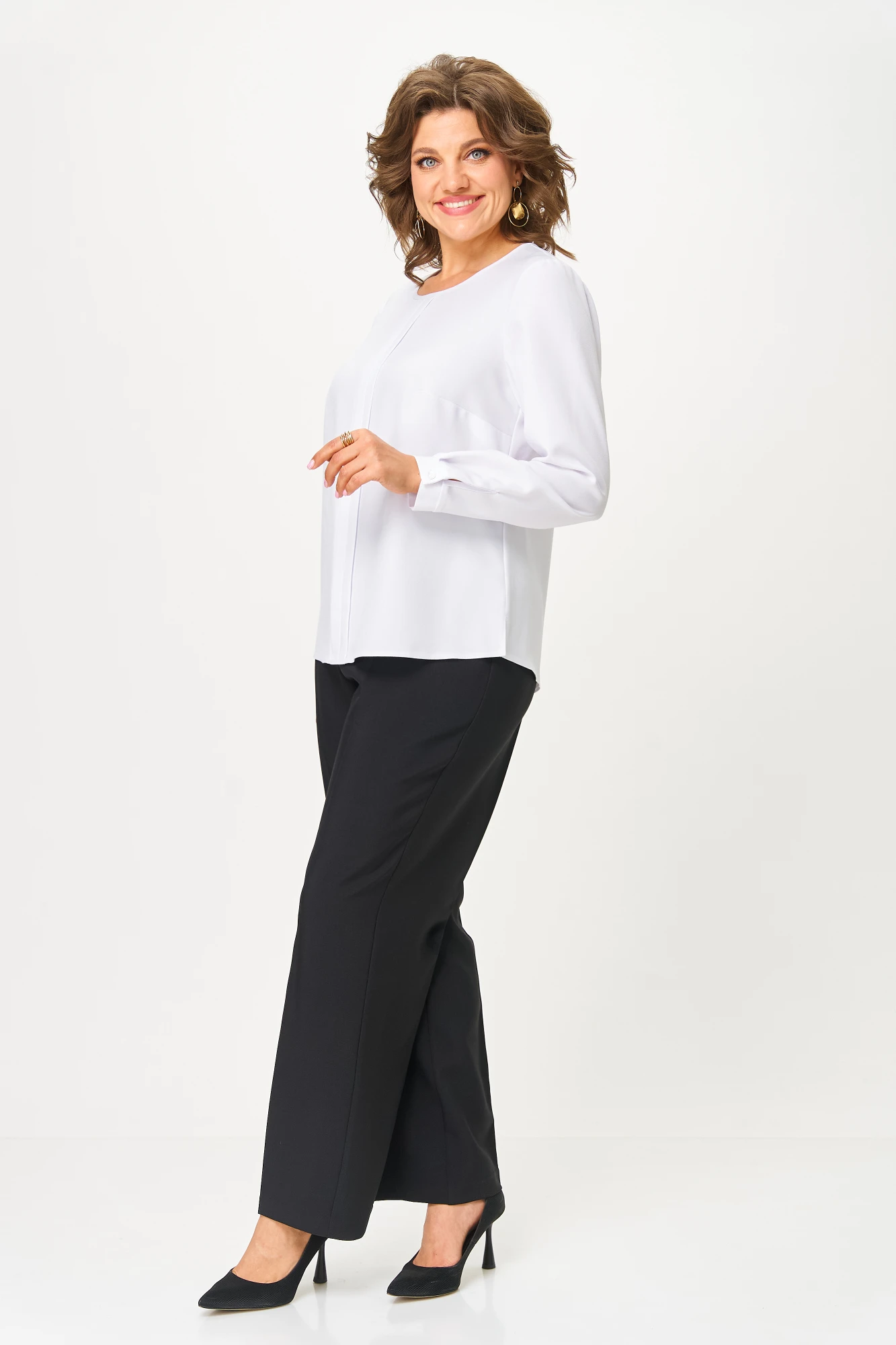 Комплект женский, состоящий из жилета, брюк и блузки. Жилет-свободной формы без бокового шва с фиксацией на пряжку и пояс в области талии. Спинка цельнокроеная. Перед с центральной бортовой застежкой на одну пуговицу. Воротник пиджачного типа с лацканами. Жилет выполнен на подкладке до низа. Брюки прямого силуэта, умеренной ширины, с притачным поясом на резинку вкруговую. Блузка прямого силуэта. Спина со средним швом. Перед с нагрудными вытачками от бокового шва, центральным швом, который подчеркнут планкой, имитирующей боковую складку с застрочкой по центру. Рукав втачной одношовный. По низу рукав обработан притачной манжетой на пуговицу. В области бокового шва по низу предусмотрены разрезы. Горловина блузки окантована с завершением застежки в области спинки, на