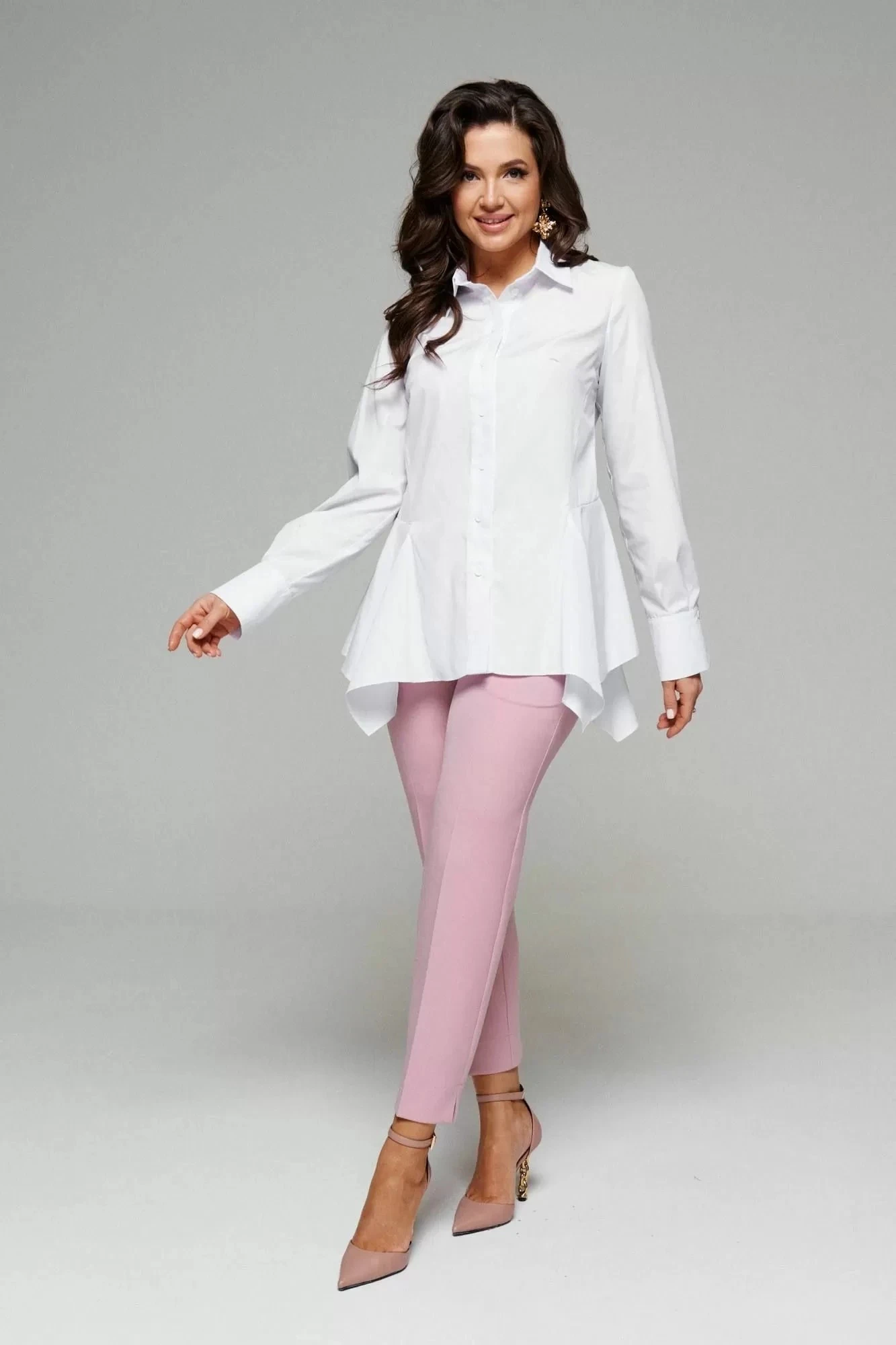 Блуза отрезная по лини талии с декоративными вставками в нижней части, которые задают силуэтное расширение в области бедер. Нижний край блузы неровный. Воротник рубашечный, на стойке. Застежка центральная, на петли и пуговицы. Рукав длинный, одношовный, втачной. Нижний край рукава обработан широкой манжетой, застегивающаяся на пуговицу. При желании потребителя манжета может быть использована в подвернутом виде.