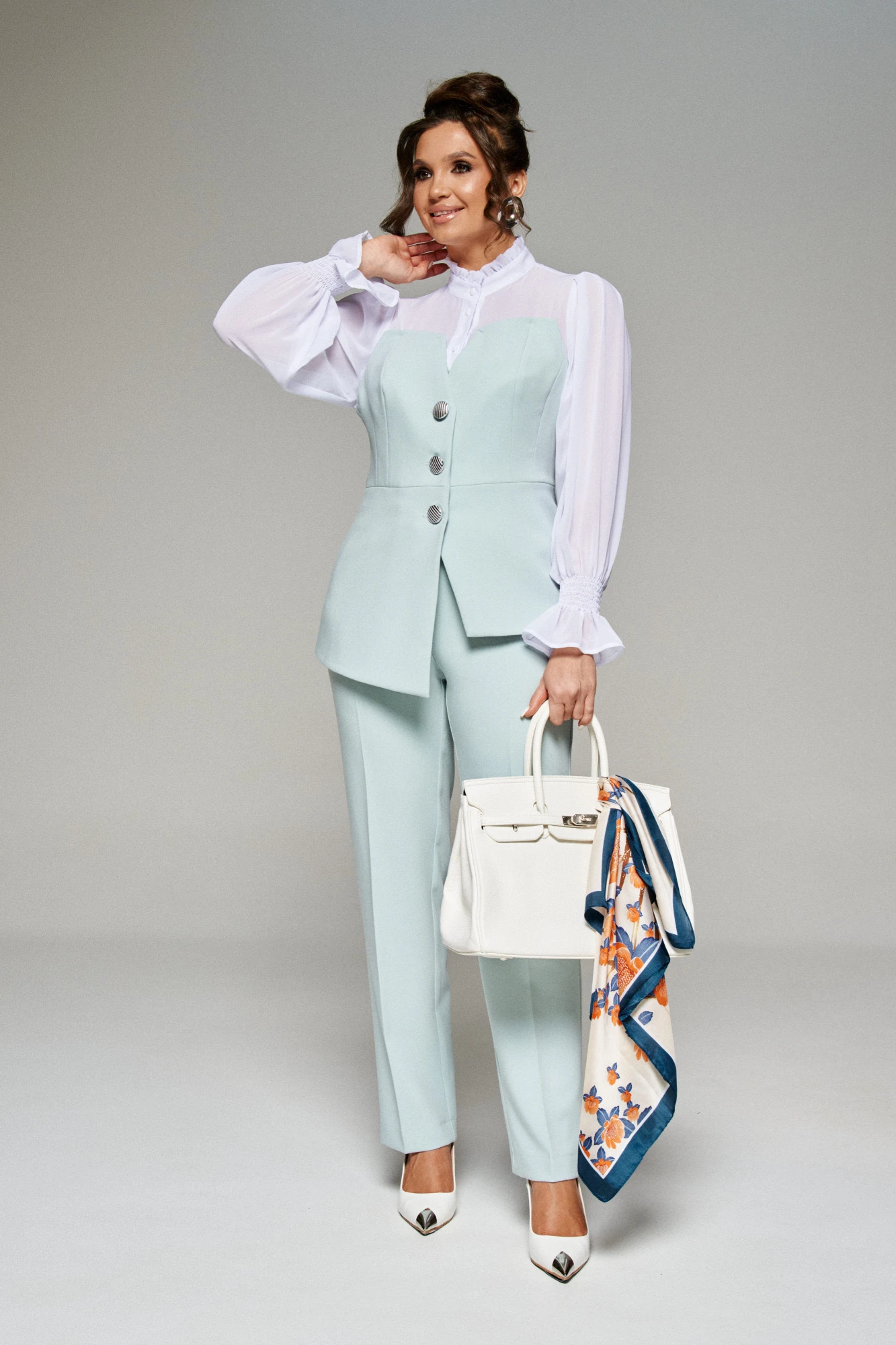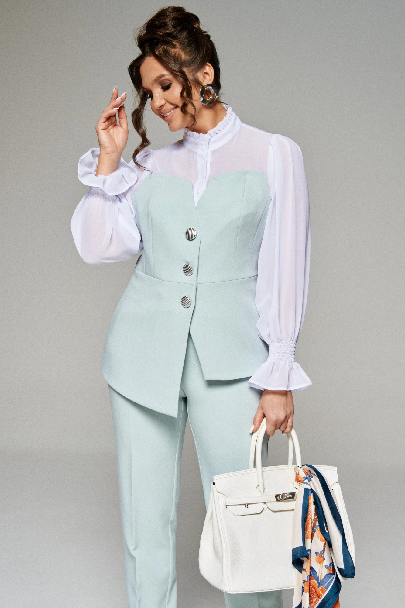 Женственный и в то же время лаконичный образ, который поможет сделать любой день особенным, несомненно можно найти в изысканном комплекте из жилета, имитирующего корсет с романтической блузкой, и элегантных брюк. Выполнен в комбинации из костюмно-смесового полотна с нежной, бархатистой фактурой, приятной на ощупь и матовой поверхностью и полупрозрачного невесомого и необыкновенно нежного шифона.