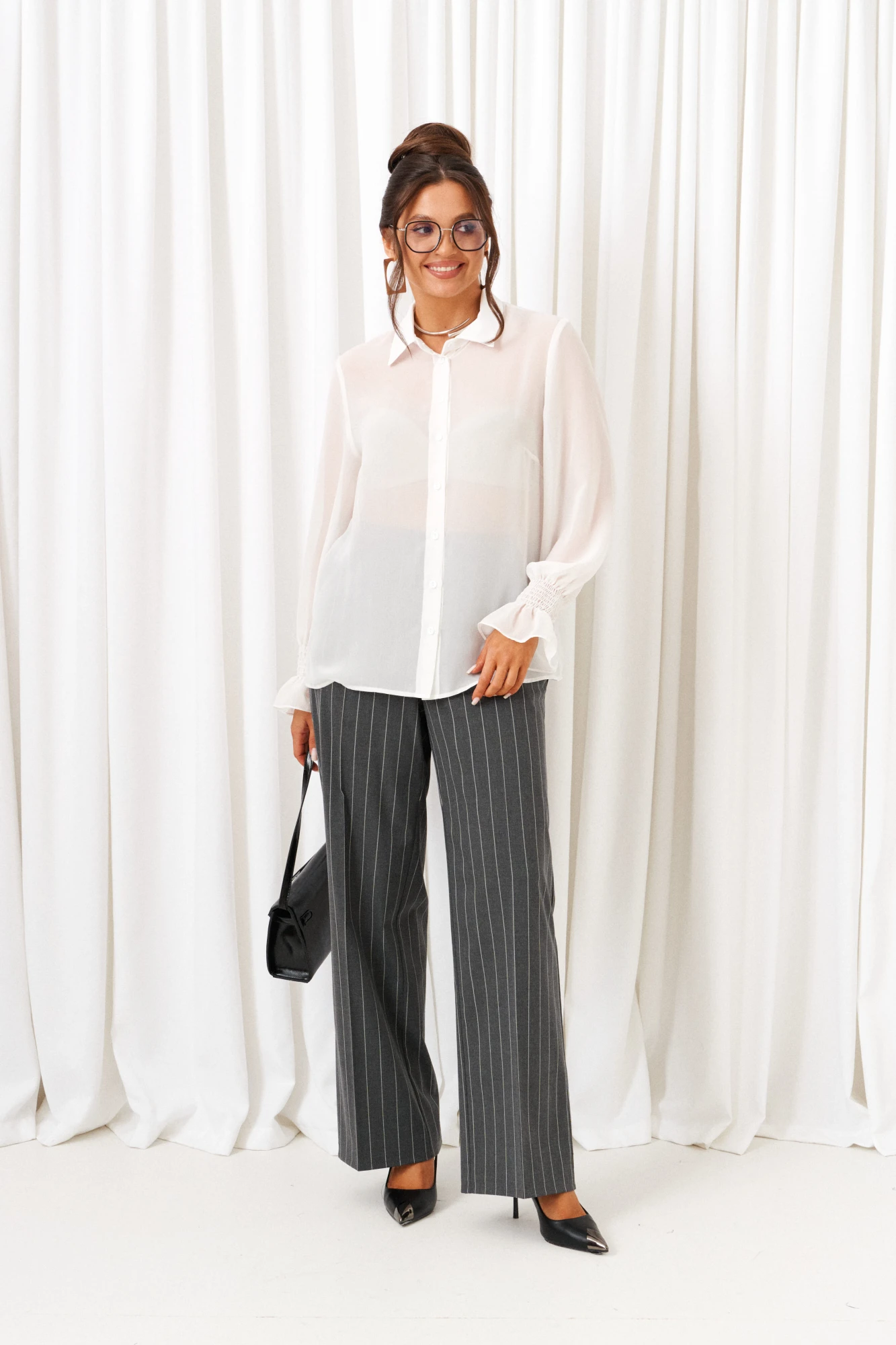 Блузка рубашечного типа выполнена из легкой, струящейся шифоновой ткани.