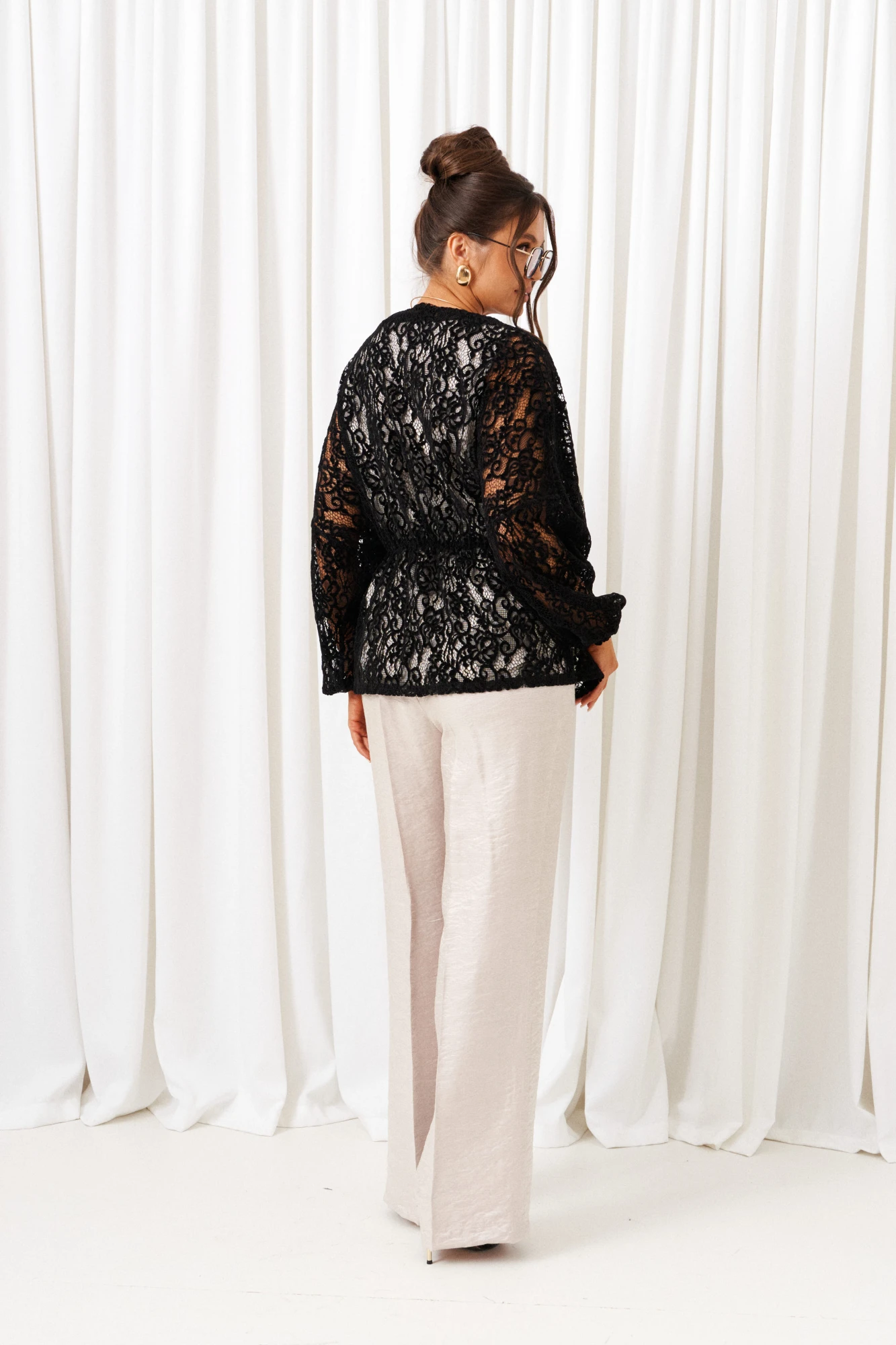 Брючный комплект в комбинации сияющего роскошного атласа с эффектным кружевом не останется незаметным!