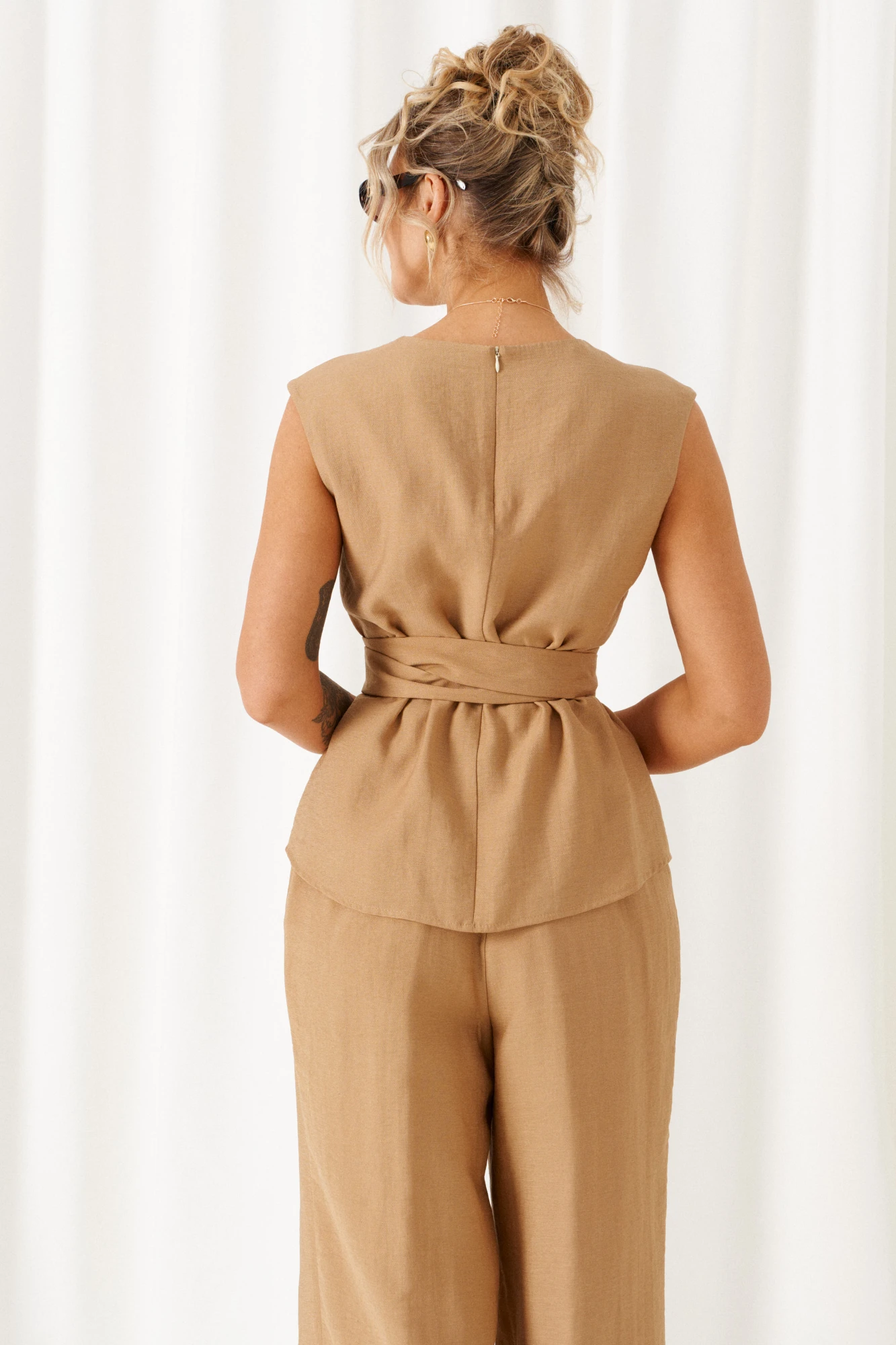Блузка полуприлегающего силуэта свободного кроя, со слегка удлиненной линией плеча, без рукава. Индивидуальность изделию придает цельнокроеная деталь, выполняющая роль пояса-завязки, который перекручиваясь создает красивый узел спереди и фиксирует талию.