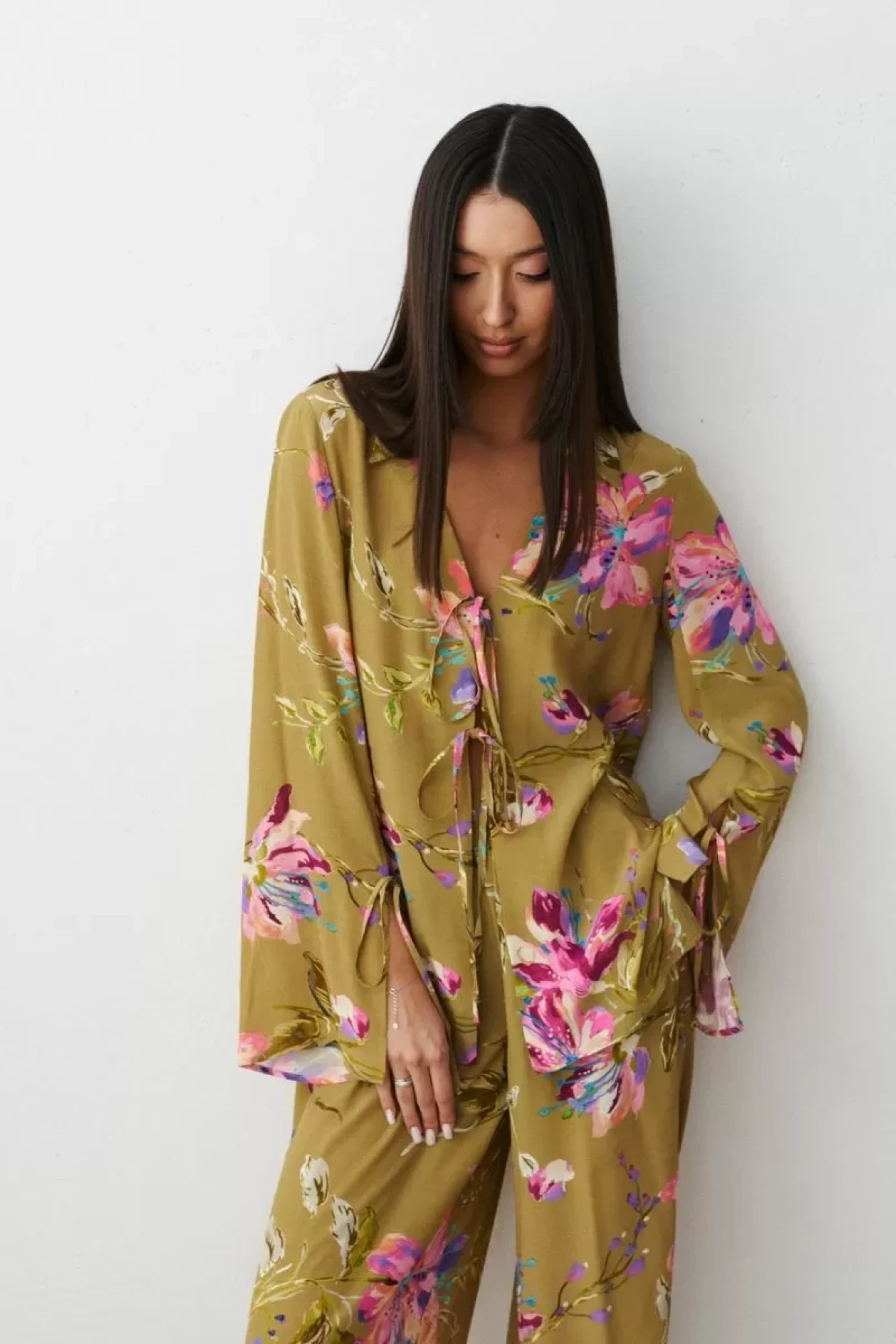 Комплект состоит из рубашки и брюк выполнен из струящегося полотна с цветочным принтом. Характеристики: рубашка прямой крой, отложной воротник, V образный вырез горловины, по переду функциональные завязки, рукав втачной, по низу рукава декоративные разрезы на завязках, спинка цельнокроеная. Длина по спинке 69 см, длина рукава 66 см. Брюки прямого свободного кроя, пояс брюк на резинке с кулиской, в боковых швах карманы. Длина брюк 106 см.