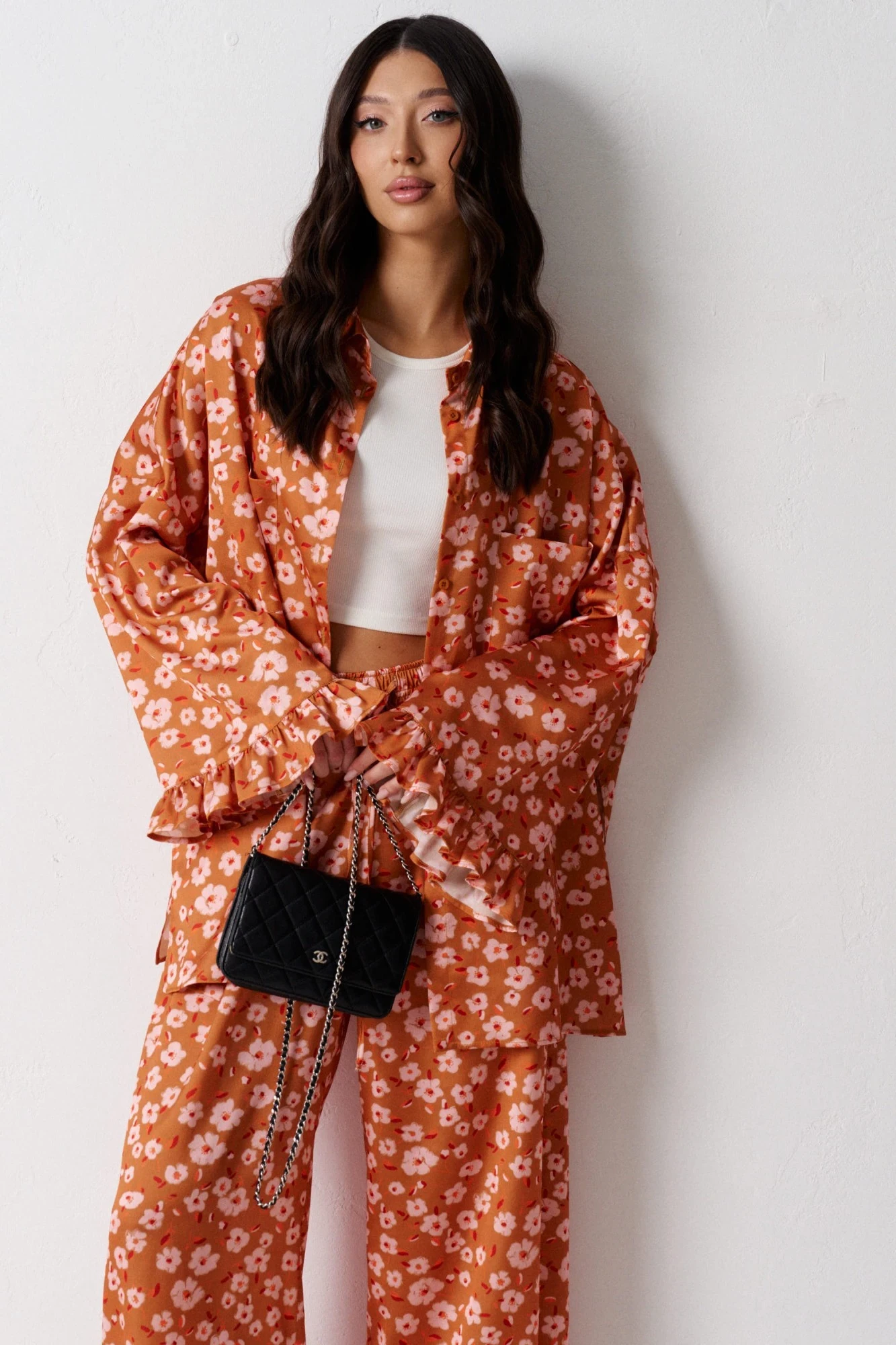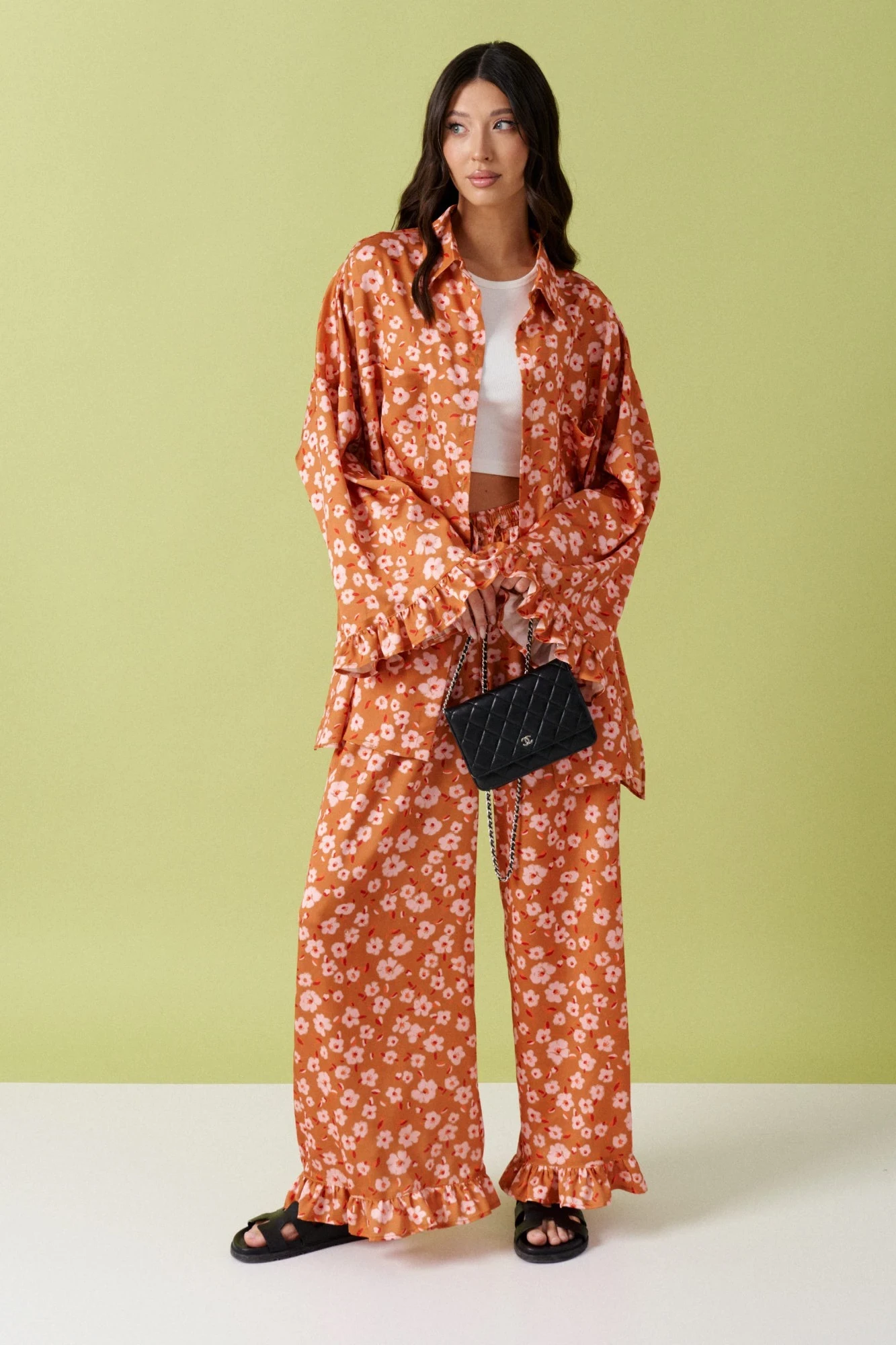 Комплект состоит из рубашки и брюк выполнен из ткани с цветочным принтом. Характеристики: рубашка прямого кроя, отложной воротник на стойке , застежка центральная на петли пуговицы, по переду крупные накладные карманы, рукав свободного кроя спущен, по низу рукава рюша выполнена из ткани основного изделия, в боковых швах разрезы. Брюки прямого кроя, пояс на резинке, в боковых швах карманы, по низу брюк рюша выполнена из ткани основного изделия.