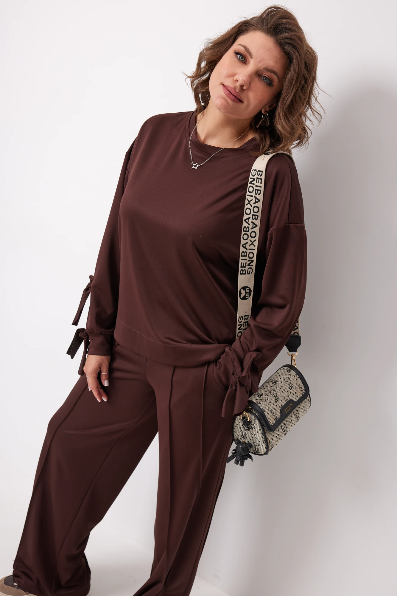 Невероятно уютный, универсальный трикотажный комплект, состоящий из свитшота и брюк свободного кроя. Вы непременно окажетесь в центре внимания, благодаря современному крою и оригинальной расцветке этой модели. Комплект подарит чувство уюта и комфорта. Декоративная отделка пришивными бантами из основного материала с необработанным срезом добавляет шарм его обладательнице.