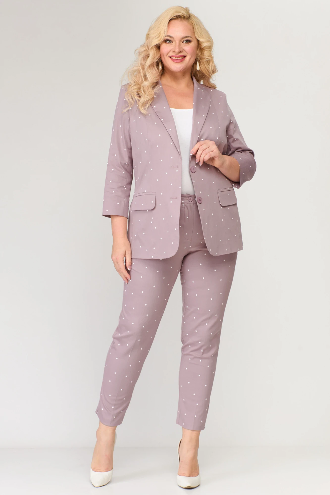 Комплект 2-х предметный из хлопковой ткани, состоит из жакета и и брюк. Жакет женский удлиненный, полуприлегающего силуэта с центральной бортовой застежкой на пуговицы до линии перегиба лацкана. Спереди рельефные швы от плечевого шва, отрезной бочок и карман с клапаном. Спинка с рельефами от плечевого шва. Рукав втачной, двухшовный, 3/4, с небольшим разрезом в локтевом шве. Воротник пиджачного типа. Перед жакета на подкладке. Длина рукава 50, длина по спинке 68 см. Классические брюки, прямые, слегка заужены к низу,заутюжены стрелки,по переду обработаны карманы с отрезным бочком,застежка на тесьму-молнию и 1 пуговицу.На задних половинках обработаны вытачки и имитация карманов в рамку с двумя обтачками,пояс в брюках притачной. По низу брюк в боковом шве есть небольшой разрез. Длина брюк от талии по боковому шву 93 см