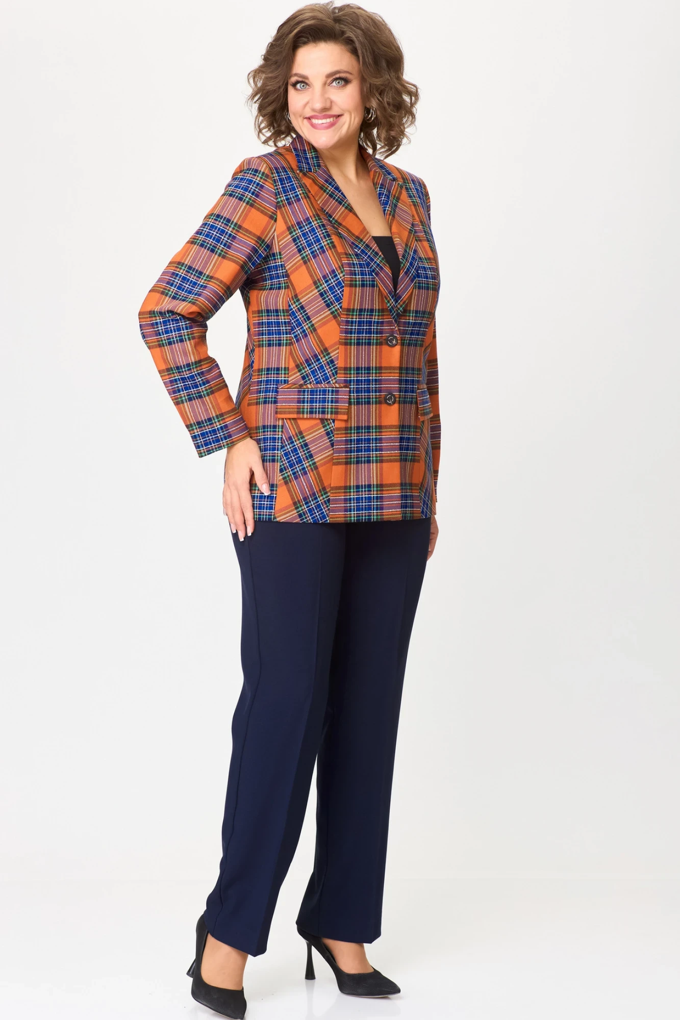 Брючный костюм БелЭльСтиль 412+596 клетка терракот+синий однотон