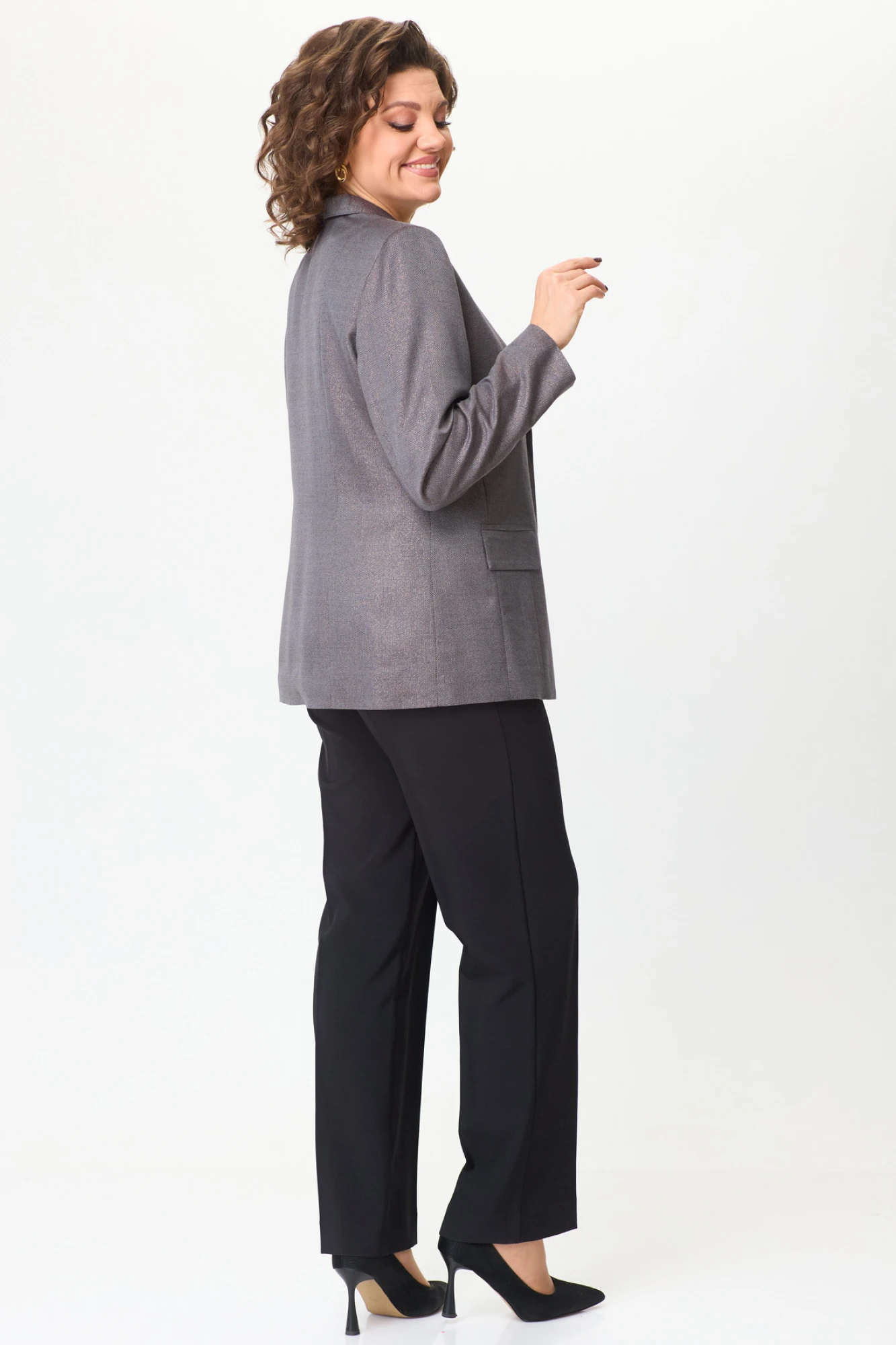 Комплект женский-двойка, из текстильной ткани, жакет удлиненный, полуприлегающего силуэта с центральной бортовой застежкой на пуговицы до линии перегиба лацкана. Спереди рельефные швы от плечевого шва, отрезной бочок и карман с клапаном. Спинка с рельефами от плечевого шва. Рукав втачной, двухшовный. Воротник пиджачного типа. Жакет на подкладке, длина по спинке 67 см, длина рукава 62 см. Брюки прямые, классические, с заутюженными стрелками, по переду обработаны карманы с отрезным бочком, застежка на тесьму-молнию и 1 пуговицу. На задних половинках обработаны вытачки и имитация карманов с листочкой, пояс в брюках притачной. Длина брюк от талии по боковому шву 103 см