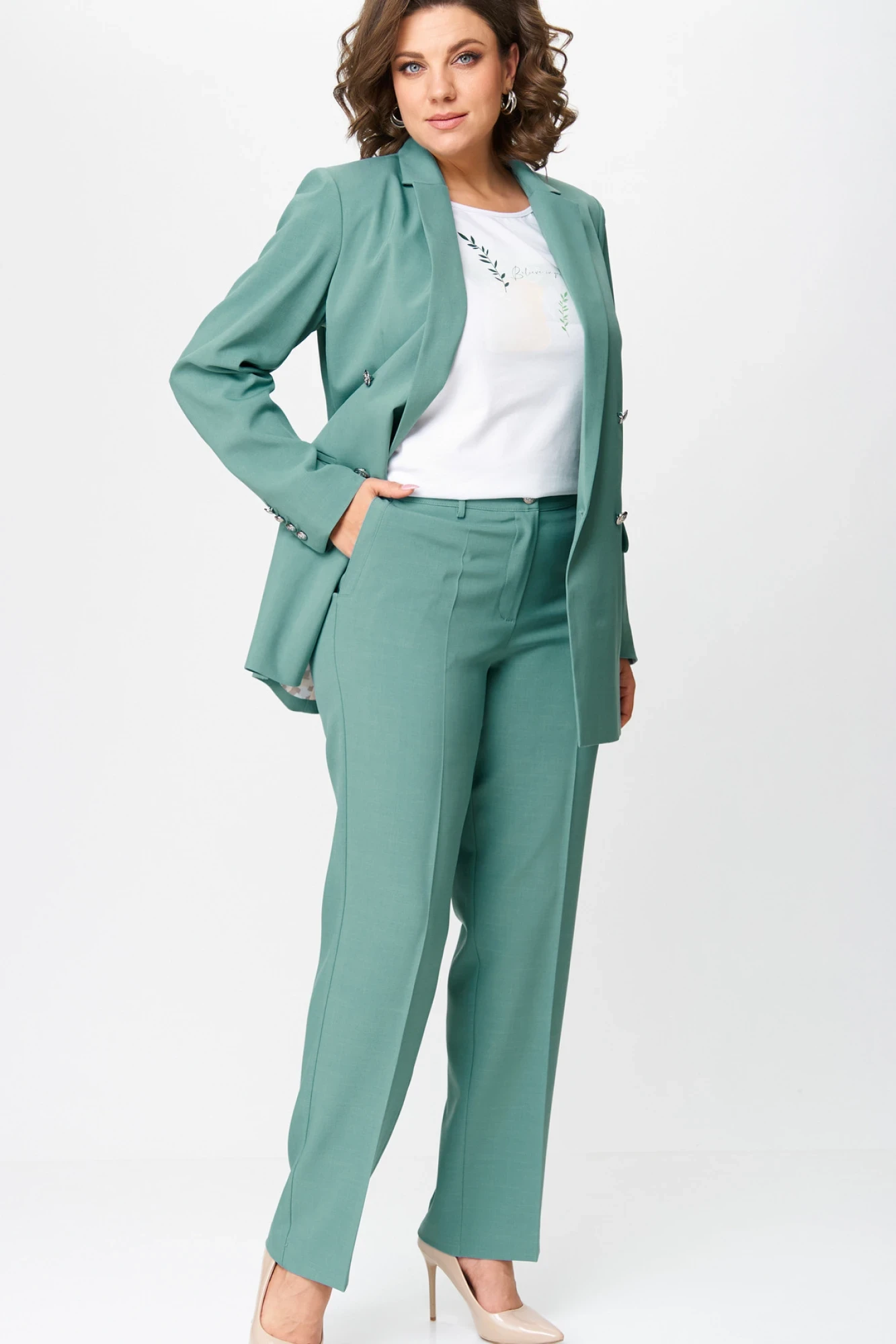 Комплект 2-х предметный состоит из жакета и и брюк. Двубортный жакет, свободного кроя, на подкладке. По переду имеется отрезной бочок и вертикальные вытачки. С прорезными карманами с клапаном и двумя обтачками. Спинка цельная. Воротник пиджачного типа. Рукав двухшовный, по низу рукава обработана шлица на петли-пуговицы. Длина рукава 63 см, длина по спинке 74 см. Брюки прямые, классические, с заутюженными стрелками, по переду обработаны карманы с отрезным бочком, застежка на тесьму-молнию и 1 пуговицу. На задних половинках обработаны вытачки и имитация карманов с листочкой, пояс в брюках притачной, по боковому на резинке. Длина брюк от талии по боковому шву 103 см.