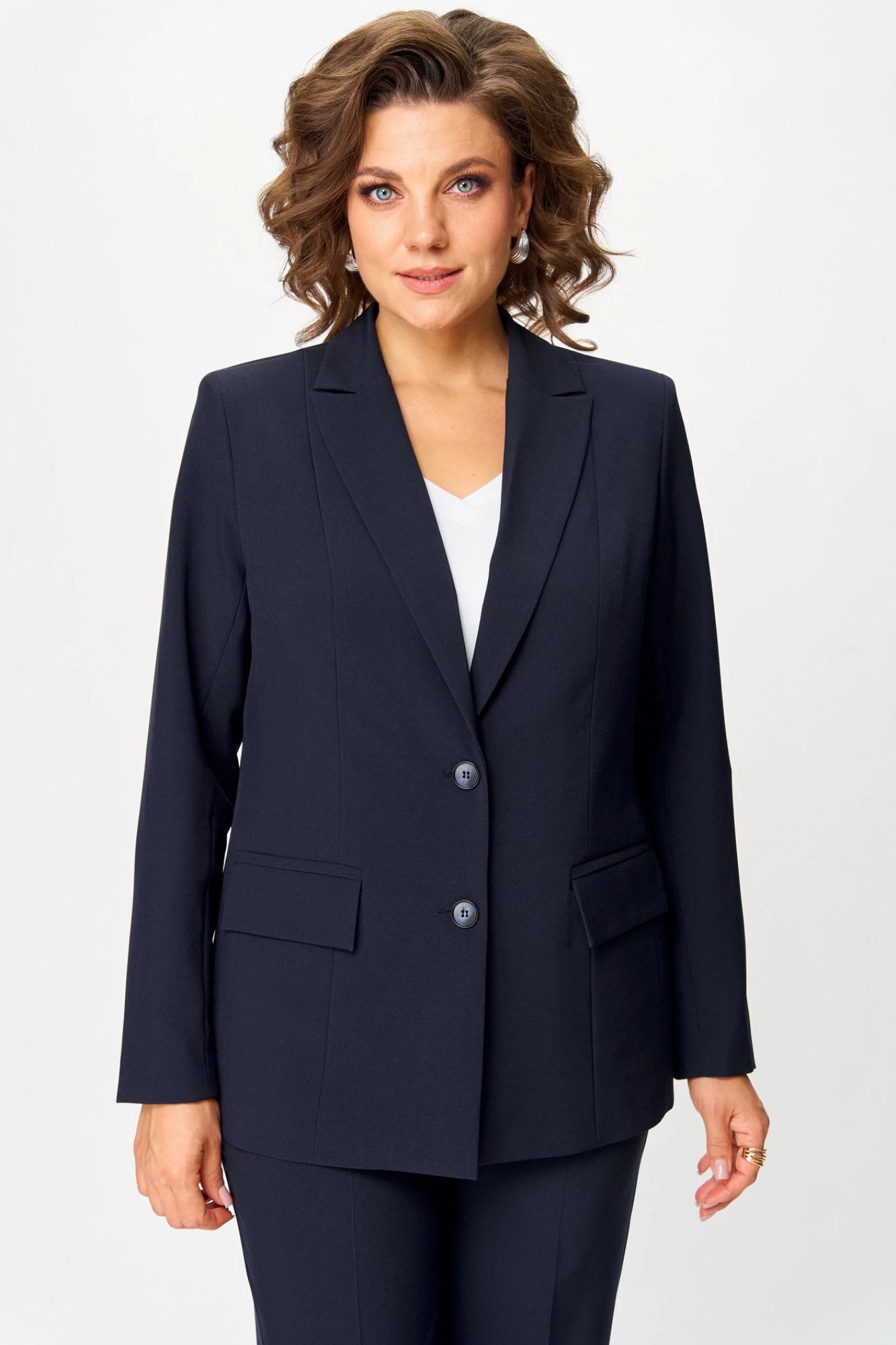 Комплект женский, 2-х предметный, состоит из жакета и и брюк. Жакет женский удлиненный, из текстильной ткани, на подкладке, полуприлегающего силуэта с центральной бортовой застежкой на пуговицы до линии перегиба лацкана. Спереди рельефные швы от плечевого шва, отрезной бочок и карман с клапаном. Спинка с рельефами от плечевого шва. Рукав втачной, двухшовный, по низу рукава обработана шлица на петли-пуговицы. Воротник пиджачного типа. Длина по спинке 66 см, длина рукава 62 см.Брюки прямые,классические, с заутюженными стрелками,по переду обработаны карманы с отрезным бочком,застежка на тесьму-молнию и 1 пуговицу.На задних половинках обработаны вытачки и имитация карманов с листочкой, пояс в брюках притачной. Длина брюк от талии по боковому шву 103 см.