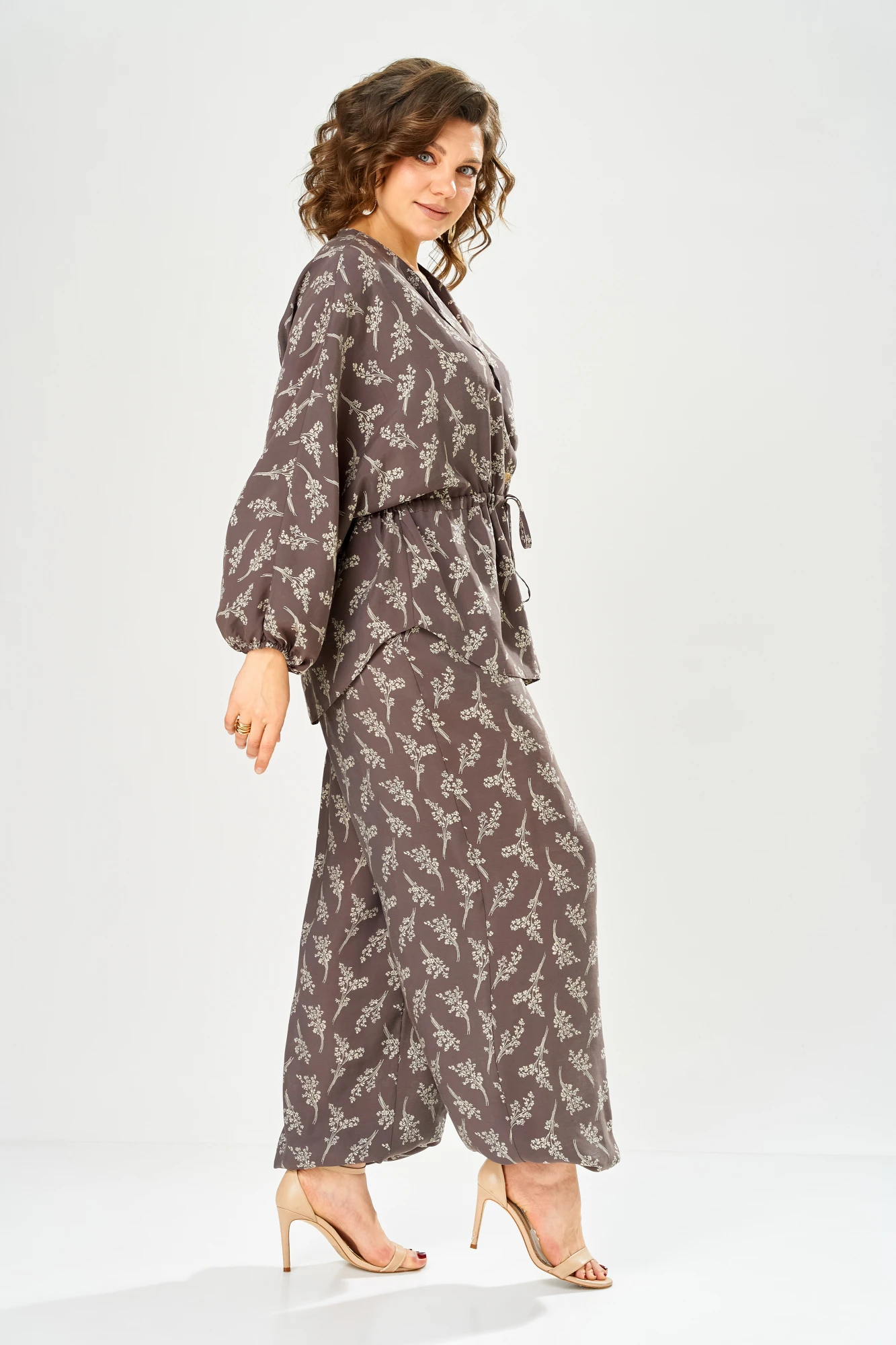 Элегантный женский костюм, выполнен из легкой комфортной ткани. Состоит из блузы и брюк.