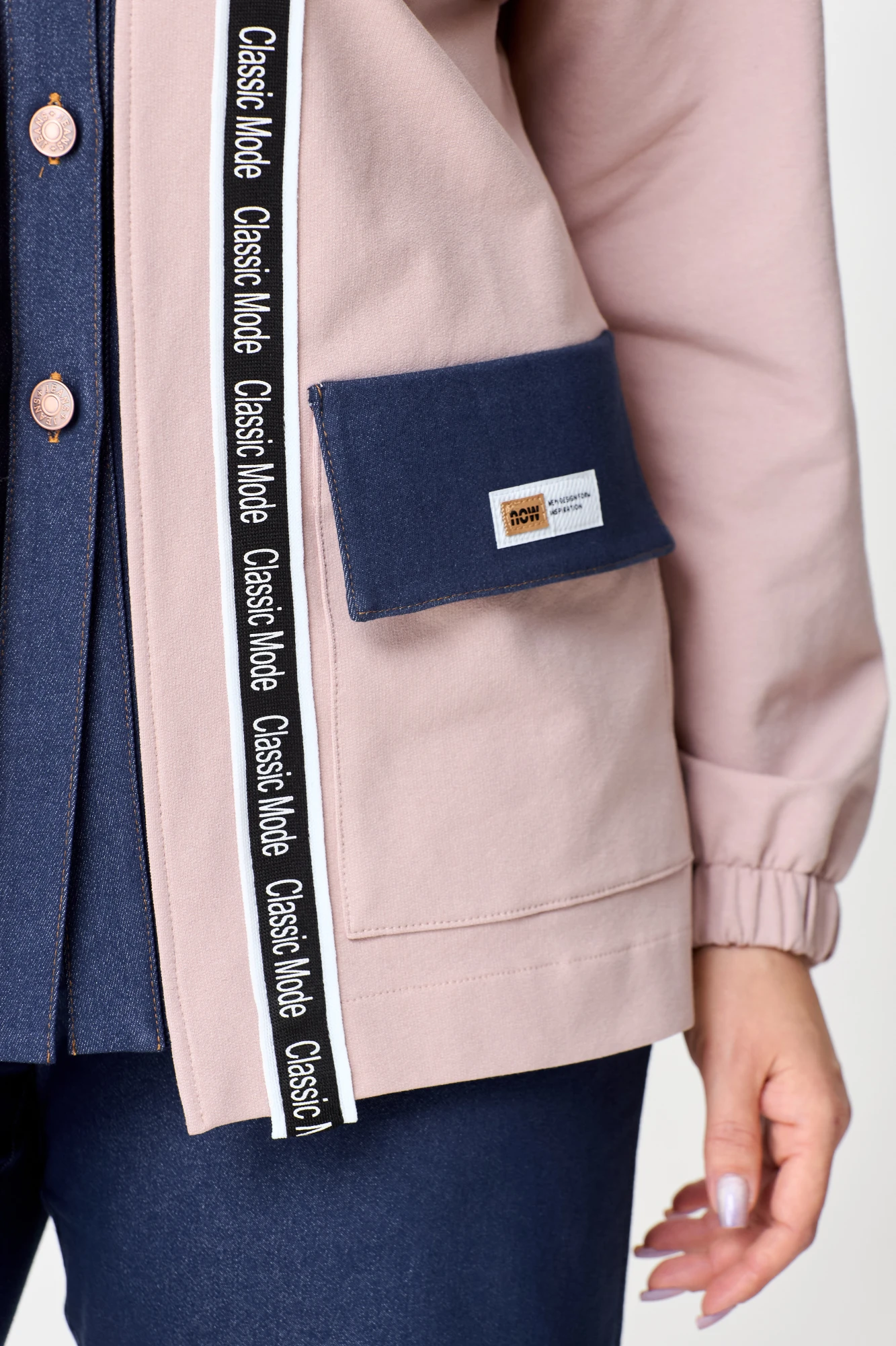Жакет выполнен из двух видов ткани, джинса и футера, в виде имитации рубашки с кардиганом. Жакет с центральной застежкой на пуговицы, горловина с рубашечным воротником на стойке, по переду отделка тесьмой, в нижней части накладные карманы с клапаном. Рукава втачные со спущенной проймой, по низу на резинке.