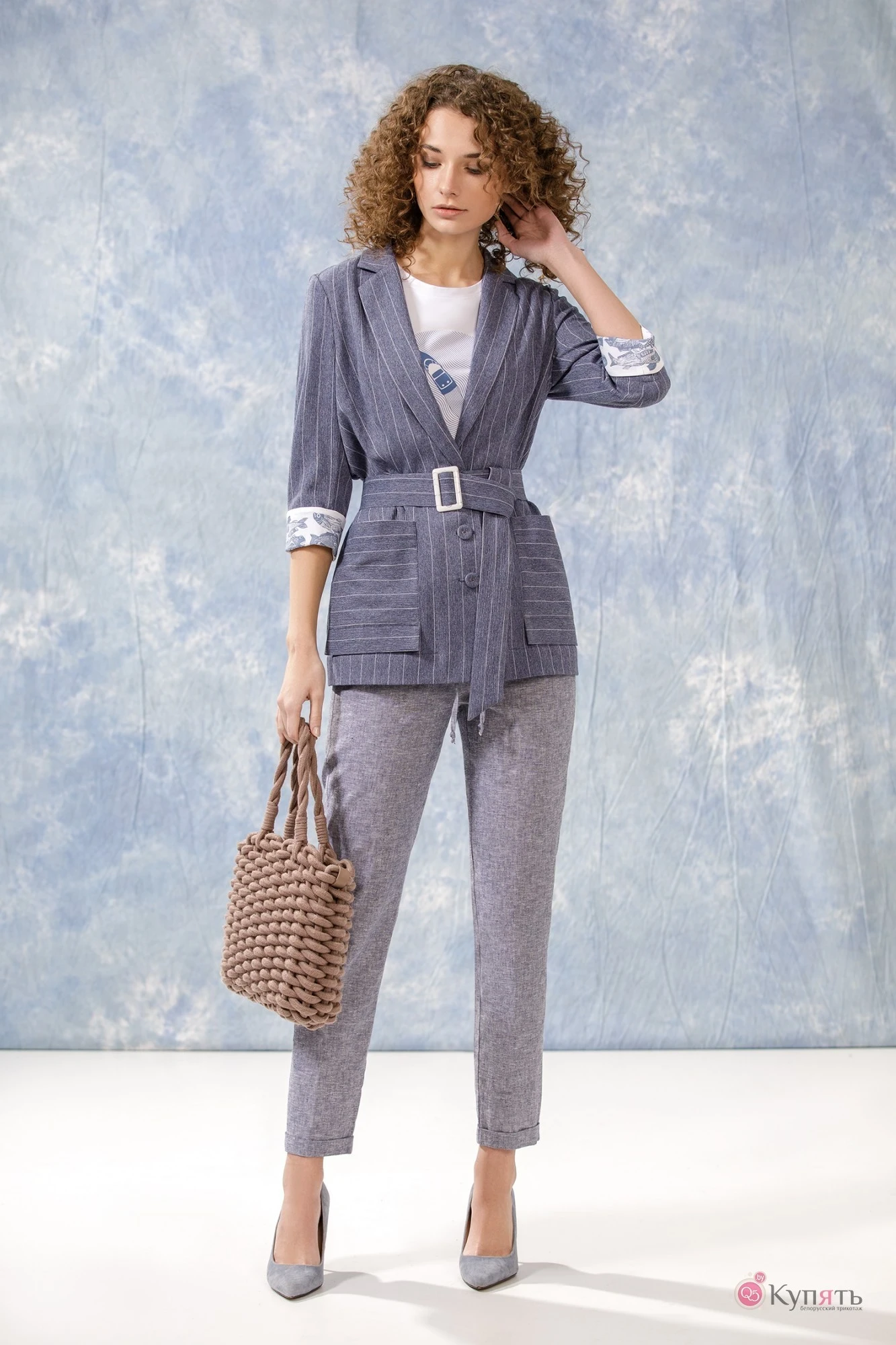 Комплект брючный состоящий из жакета без подкладки, брюк и футболки. Жакет с втачным рукавом 3\4 с отложной отделочной манжетой с принтом. Жакет с отложным лацканом с воротником, вытачкой, накладным карманом, застёжкой на 3 петли-пуговицы.Спинка со средним швом внизу со шлицей. Жакет со съёмным поясом с пряжкой. Брюки на притачном поясе с резинкой и завязкой, с карманами, внизу с манжетами. Футболка с втачным коротким рукавом с принтом.