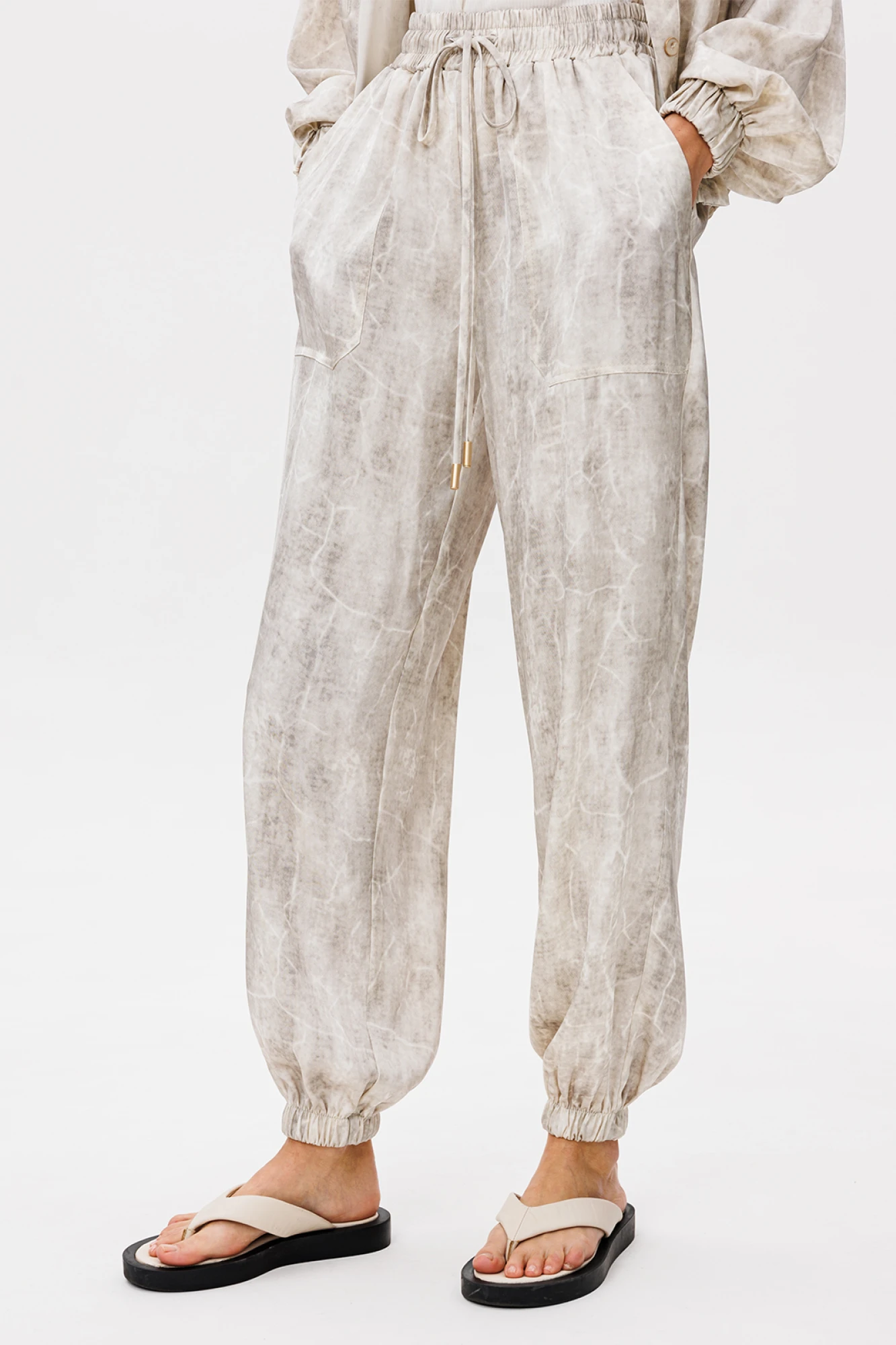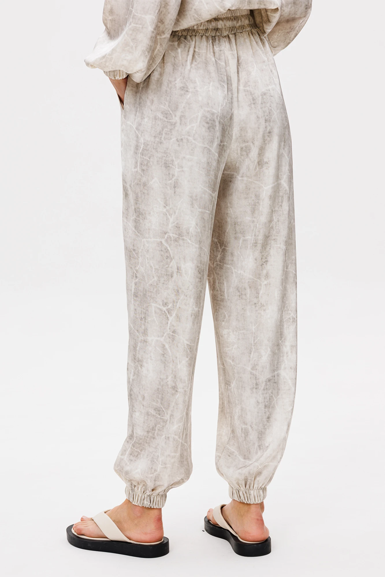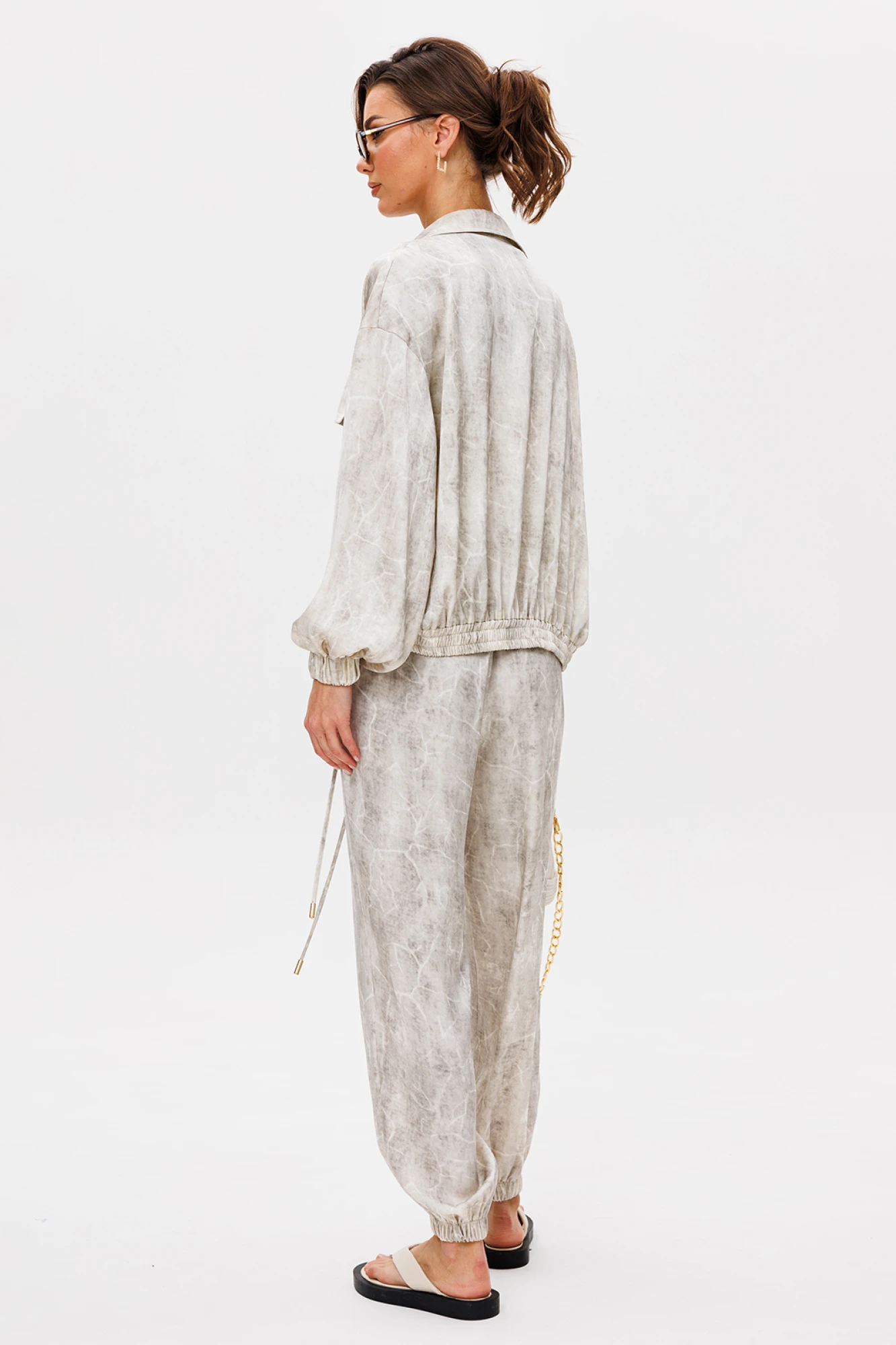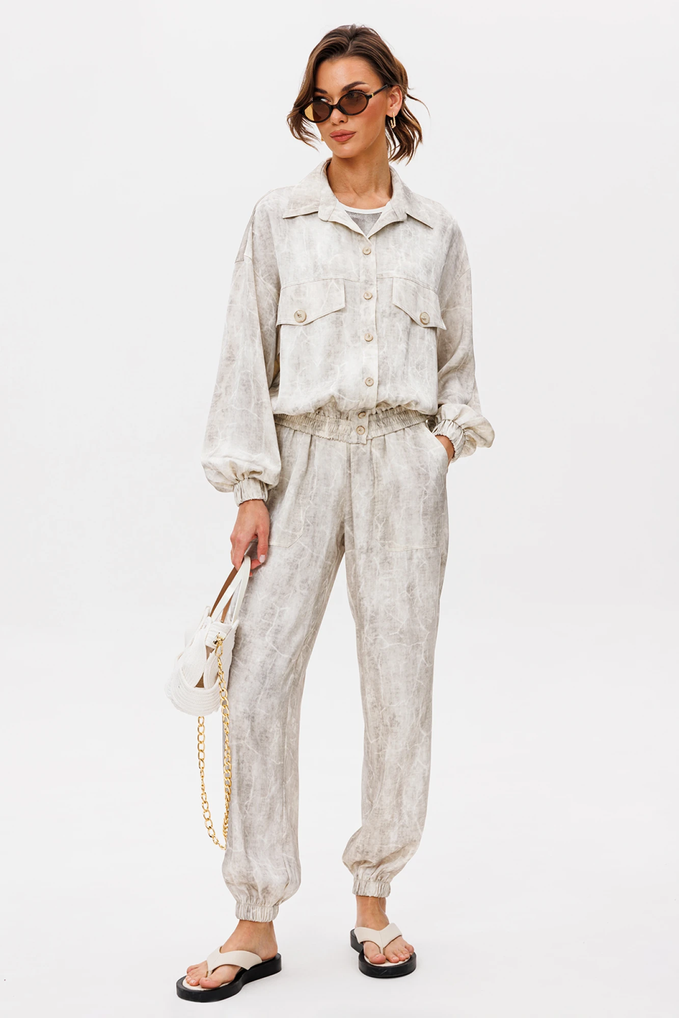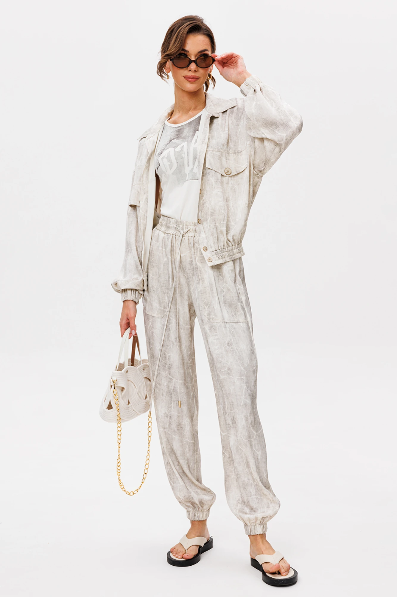 Костюм состоит из 2-х предметов бомбер и брюк. Бомбер со спущенной линией плеча и втачным рукавом внизу на притачной манжете с вставленной в нее резинкой. Полочка с центральной застежкой по притачной планке на петли-пуговицы. По переду кокетка и имитация кармана с клапаном от кокетки. По низу изделия притачная отстроченная планка с вставленной в нее резинкой. Воротник рубашечный отложной на стойке. Без подкладки. Брюки на притачном отстроченном поясе на резинке и втянутым в него шнурком из основной ткани с наконечниками. По переду вверху настрочены карманы с наклонным входом. По низу брюк планка с вставленной в нее резинкой.