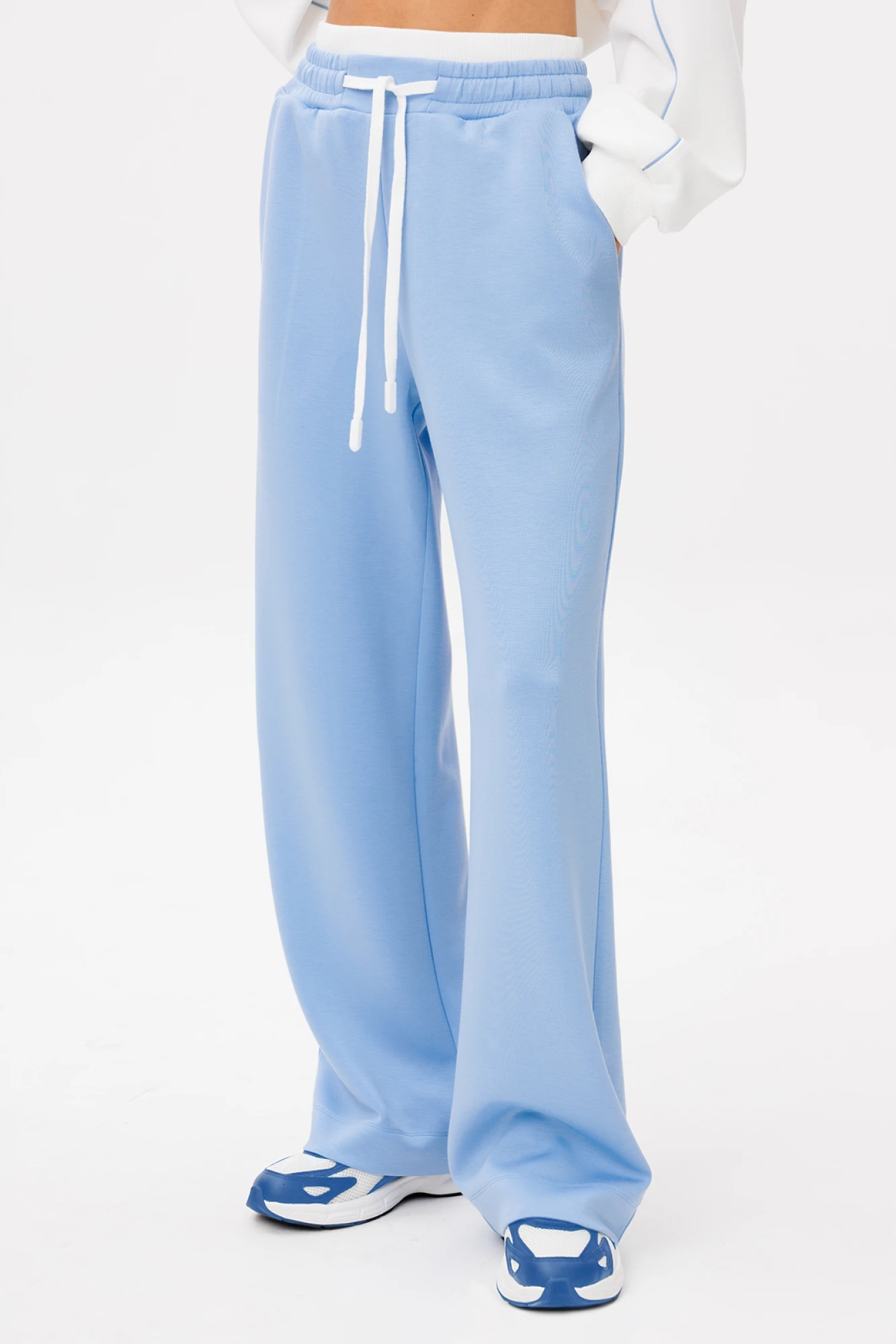 Костюм женский 2-ух предметный. Состоит из бомбера и брюк. Бомбер спортивный прямого силуэта с втачным рукавом и спущенной линией плеча, внизу рукав на манжете из довяза. Бомбер по переду с центральной застежкой на тесьму-молнию и карманами с листочкой. По горловине стойка из довяза, по низу бомбера приточная планка из довяза. По переду спинке и рукаву декоративные подрезы с вставленным в него кантом. Брюки спортивные, прямого силуэта на притачном, отстроченном поясе на резинке и втянутым в него декоративным шнуром. Над притачным поясом вставлен довяз. По переду карманы в боковых швах с наклонным входом.