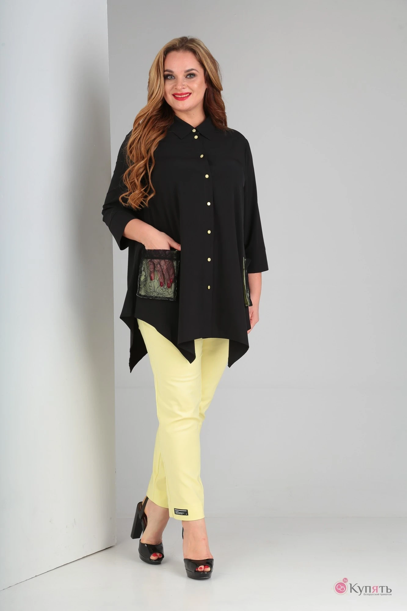 Шикарный комплект из блузы и брюк. Блуза удлиненная ,свободного (трапециевидного) силуэта из легкой ткани софт с эластаном . Воротник рубашечного типа с отрезной стойкой, по переду планка с застежкой на петли-пуговицы. Внутренняя стойка и планка выполнена из отделочной контрастной ткани. Низ блузы фигурный, что зрительно вытягивает фигуру. Спинка с притачной кокеткой, по центру неглубокая встречная складка. Накладные карманы на полочках переда - отлётные из кружева и отделочной ткани, придают особый шарм изделию. Рукав втачной одношовный, длиной 3/4 с притачным манжетом, пройма углублена. Брюки прямые, полуприлегающего силуэта, классической посадкой на талию из плотной ткани с содержанием хлопка и эластана. Пояс притачной, частично вставлена резинка от боковых швов, по переду застежка на петлю-пуговицу. Застежка по переду брюк - гульфик на тесьму-молнию. От боковых швов - наклонные внутренние карманы, внизу бокового шва выполнен неглубокий разрез. Длина брюк чуть выше щиколотки. Отличный вариант для новых образов как на каждый день, так и для более торжественных мероприятий.
