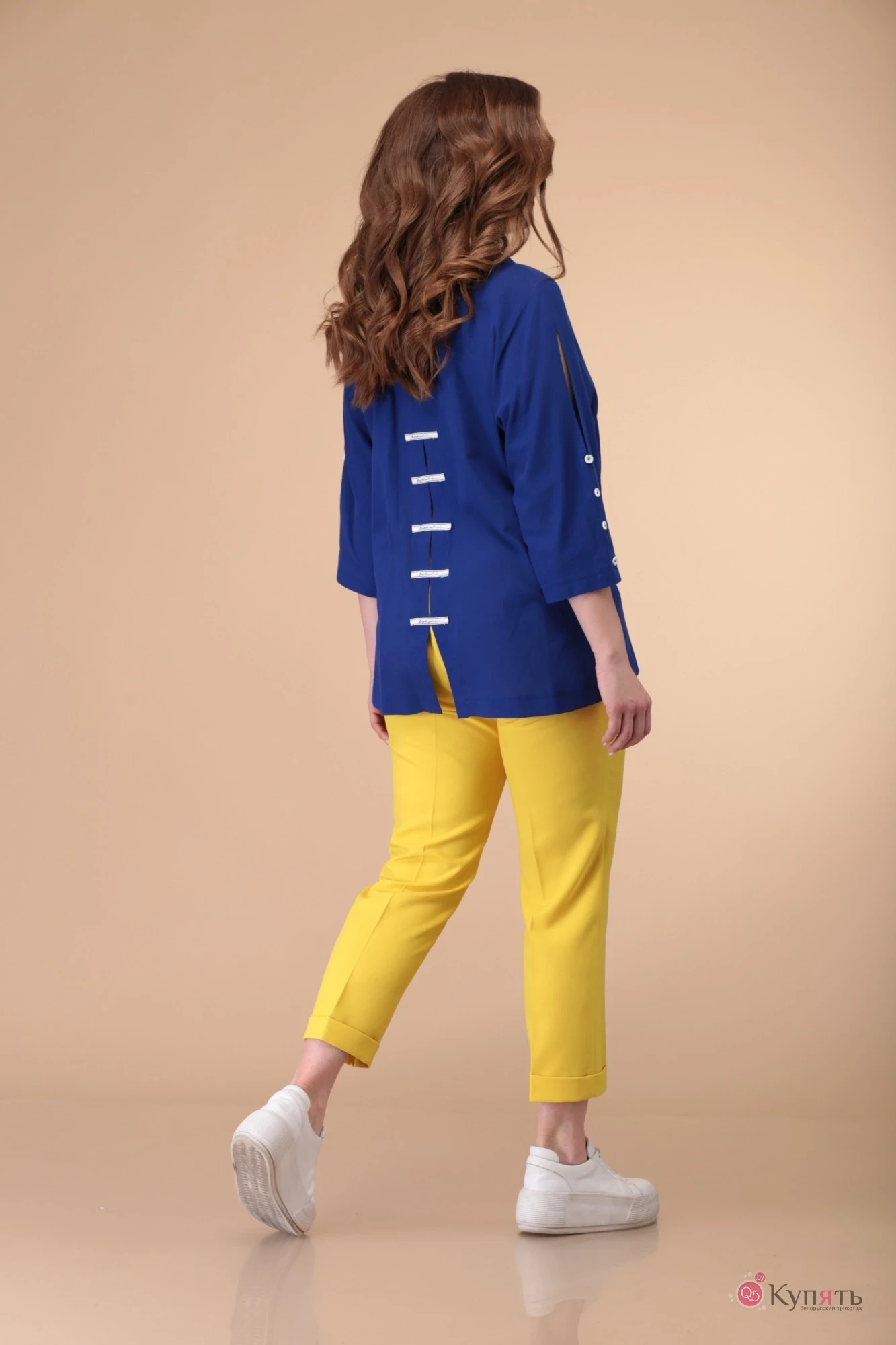 Стильный яркий костюм, состоящий из блузки-рубашки и брюк. Блузка из легкой хлопковой ткани прямого силуэта. Горловина округлая, обработана стойкой и воротником рубашечного типа. Перед с центральной застёжкой, обработан цельнокроеными планками с петлями-пуговицами. По правой планке настрочена отделочная декоративная тесьма. Низ изделия фигурный. Рукава цельнокроеные по форме «кимано»,длиной 41см. В центральном шве рукава расположен неглубокий разрез, по низу шва пришиты декоративные пуговицы. Спинка прямая с центральным швом и глубоким разрезом. Разрез декорирован настрочными элементами из контрастной тесьмы. Брюки прямые, полуприлегающего силуэта, укорочённые, длина чуть выше щиколотки, с классической посадкой на талию. Пояс втачной с застёжкой на петлю-пуговицу по переду, сзади от боковых швов пояс на эластичной резинке. По переду застежка гульфик на молнию. По боковым швам наклонные внутренние карманы, внизу брюк выполнены отложные манжеты. Превосходный вариант костюма в летние дни, а также каждая вещь может использоваться индивидуально.